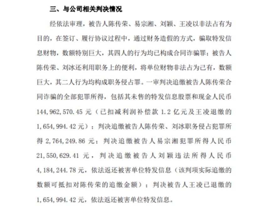 根据公告,一审判决追缴被告人陈传荣合同诈骗的全部犯罪所得,包括其未售的特发信息股票和现金1.45亿元(已扣减利润补偿款1.2亿元及王凌退缴的165.5万元);判决追缴被告人陈传荣、刘冰职务侵占犯罪所得276.42万元;判决追缴被告人易宗湘犯罪所得2155.06万元,判决追缴被告人刘颖违法所得418.42万元,依法返还特发信息(该判项实际追缴的数额可抵扣对陈传荣的追缴金额);判决被告人王凌已退缴的165.5万元,依法返还特发信息。
