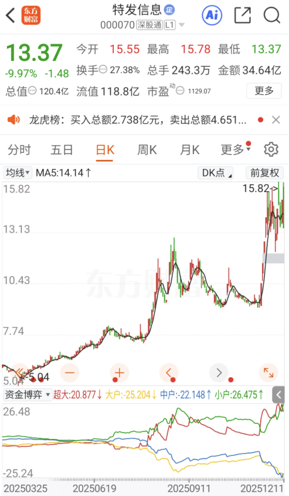 二级市场方面,特发信息年内股价涨超130%,12月11日公司股票以跌停收盘,最新股价为13.37元,总市值为120.4亿元。