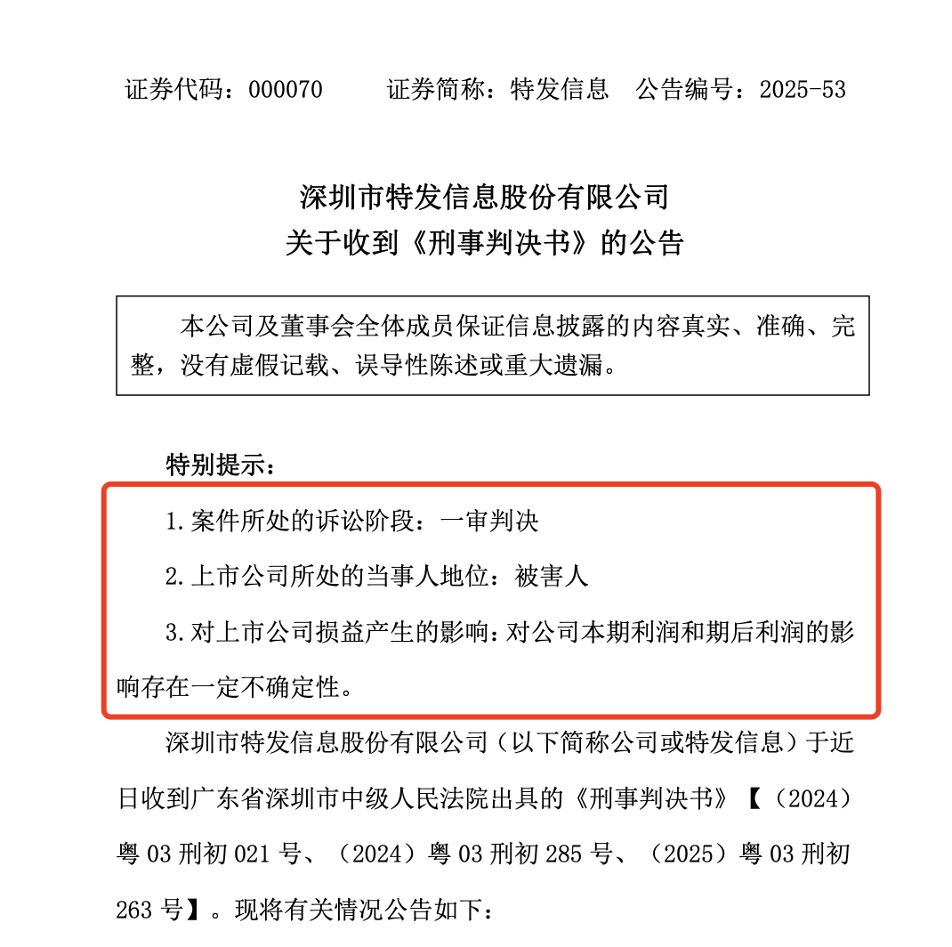 特发信息表示,本次刑事判决仅为一审判决,公司为被害单位,目前判决尚未生效,案件最终判决及后续执行结果尚存在不确定性,对公司本期利润和期后利润的影响存在一定不确定性。
