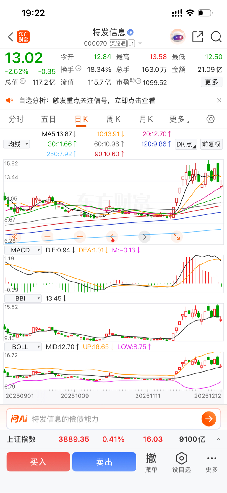 三大指标走坏两个,Macd出绿柱,BBi也是牛熊分界线下轨,只有一个BoLL还没