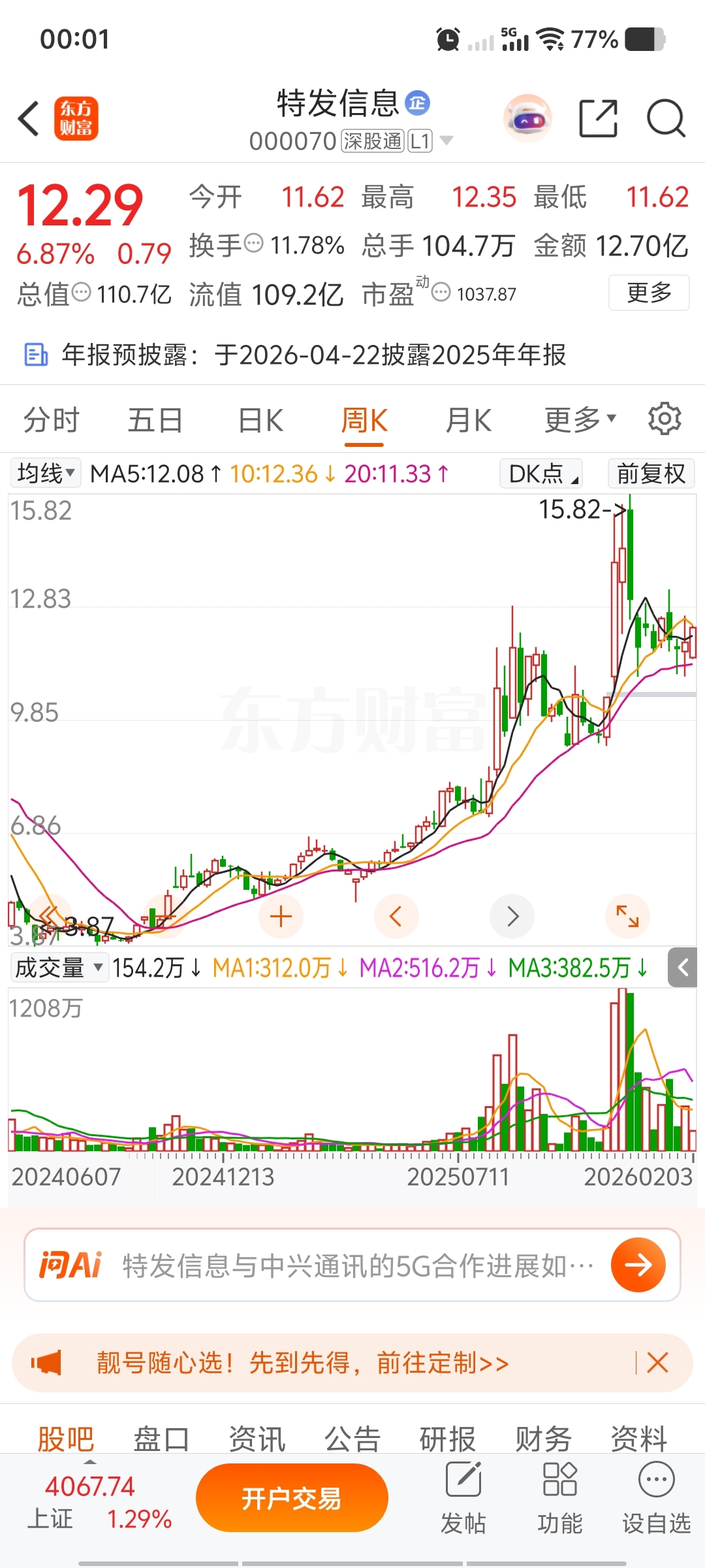 $特发信息(SZ000070)$ 老规矩高开秒板,或者低开低走负7上下,涨的全部跌回去,,这个走势太强势,全程6个点上下吸货,尾盘主力还抢了一波,明天看多,第一次吹,明天大概率涨停板,7成把握,