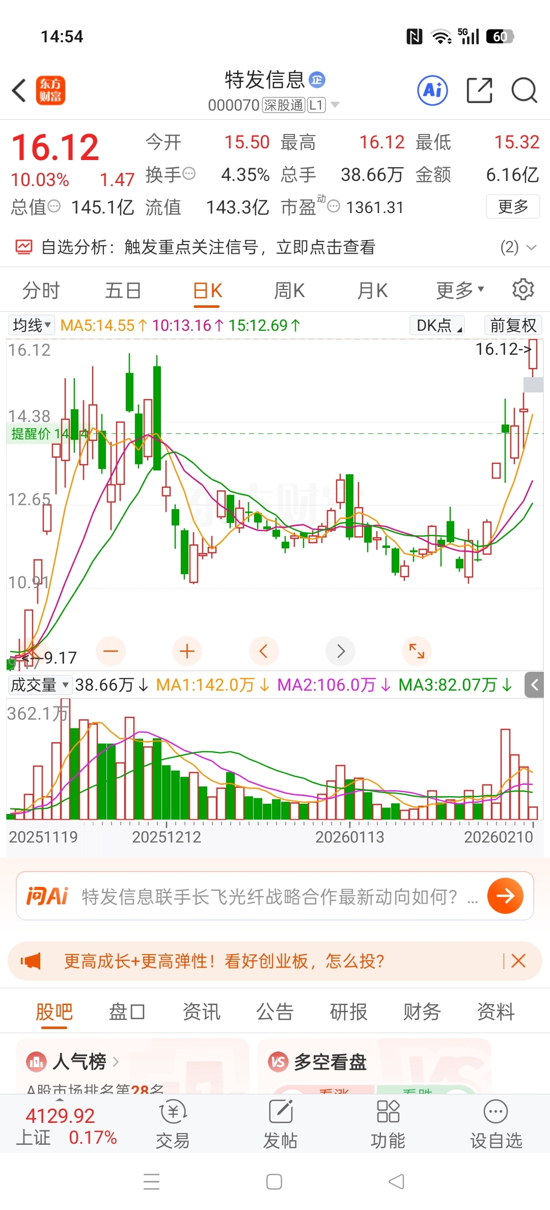 $特发信息(SZ000070)$ 特发是昨天买点,周五均价上移过阴线