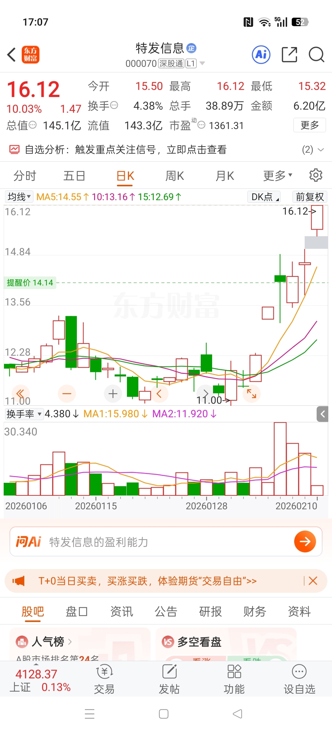 $特发信息(SZ000070)$ 特发昨天收盘看准备今天低开买14.14,周五就均价突破了不打开分时图根本不知道,周一高开回踩14.14下正好是买点,今天没得机会开太高了