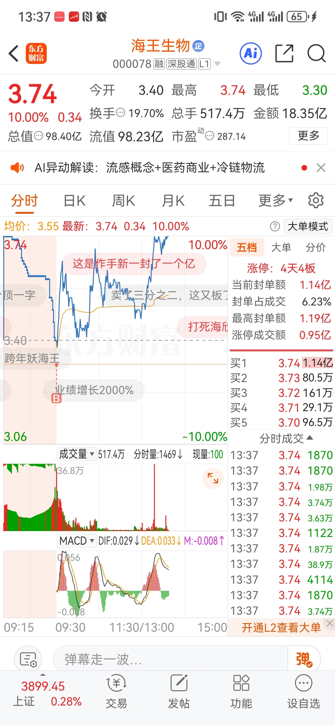 $海王生物(SZ000078)$ 连续三天爆量,上有5.6板压制,板块又对不上!看不懂看不懂