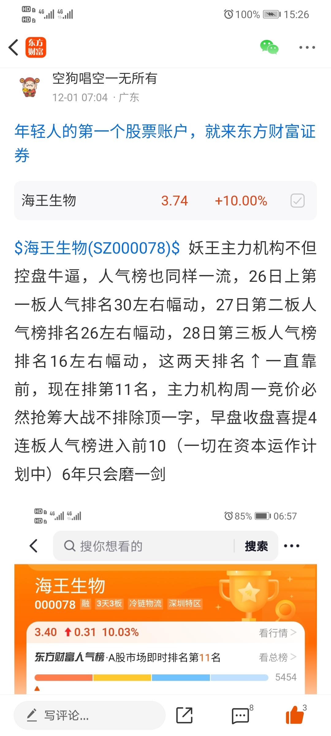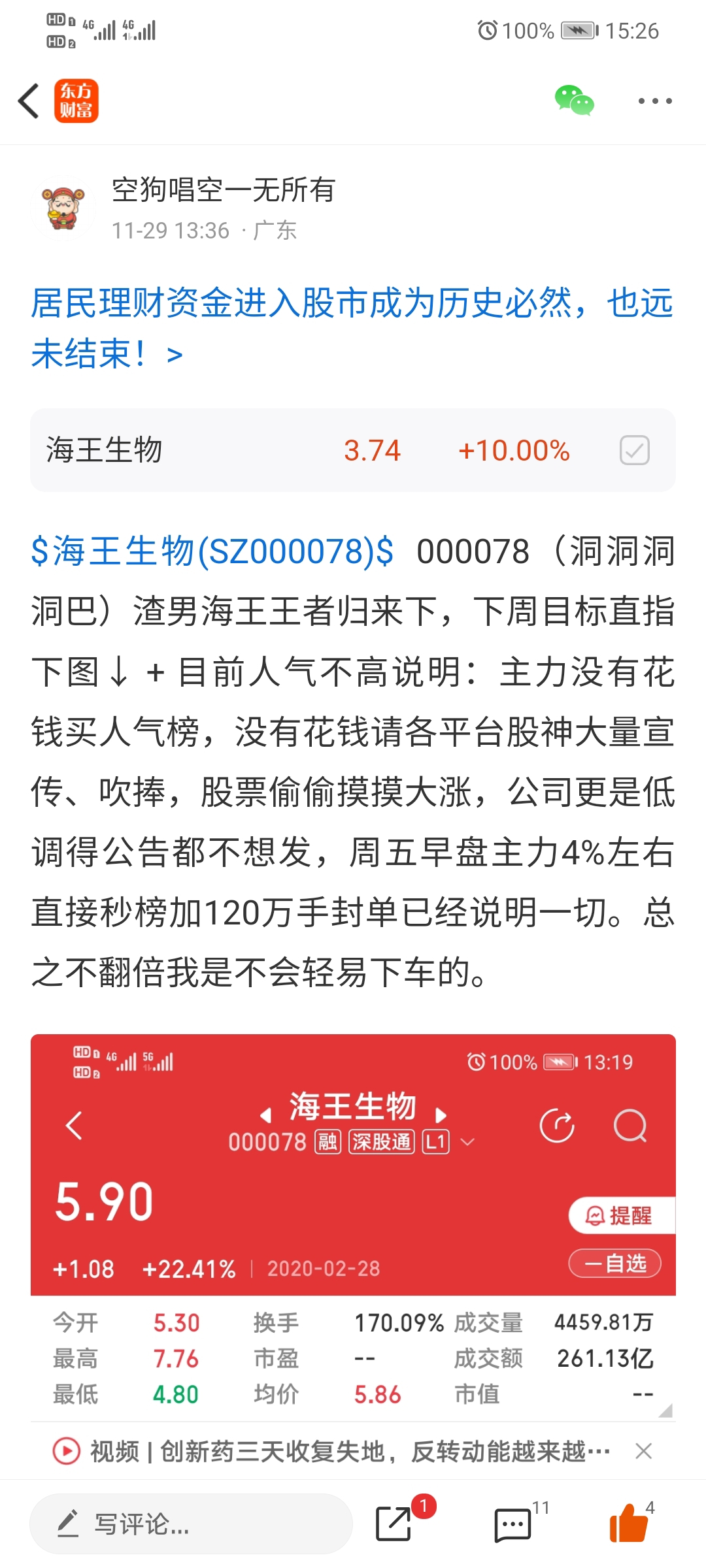 $海王生物(SZ000078)$ 股市流行踏空8步曲:一板买不进,二板犹犹豫豫,三板再三考虑,四板买不进,五板太高不敢买,六板嗷嗷叫,七板拍断腿,八板回调大胆梭哈吃大面 我一直在格局中,不翻倍不下车。