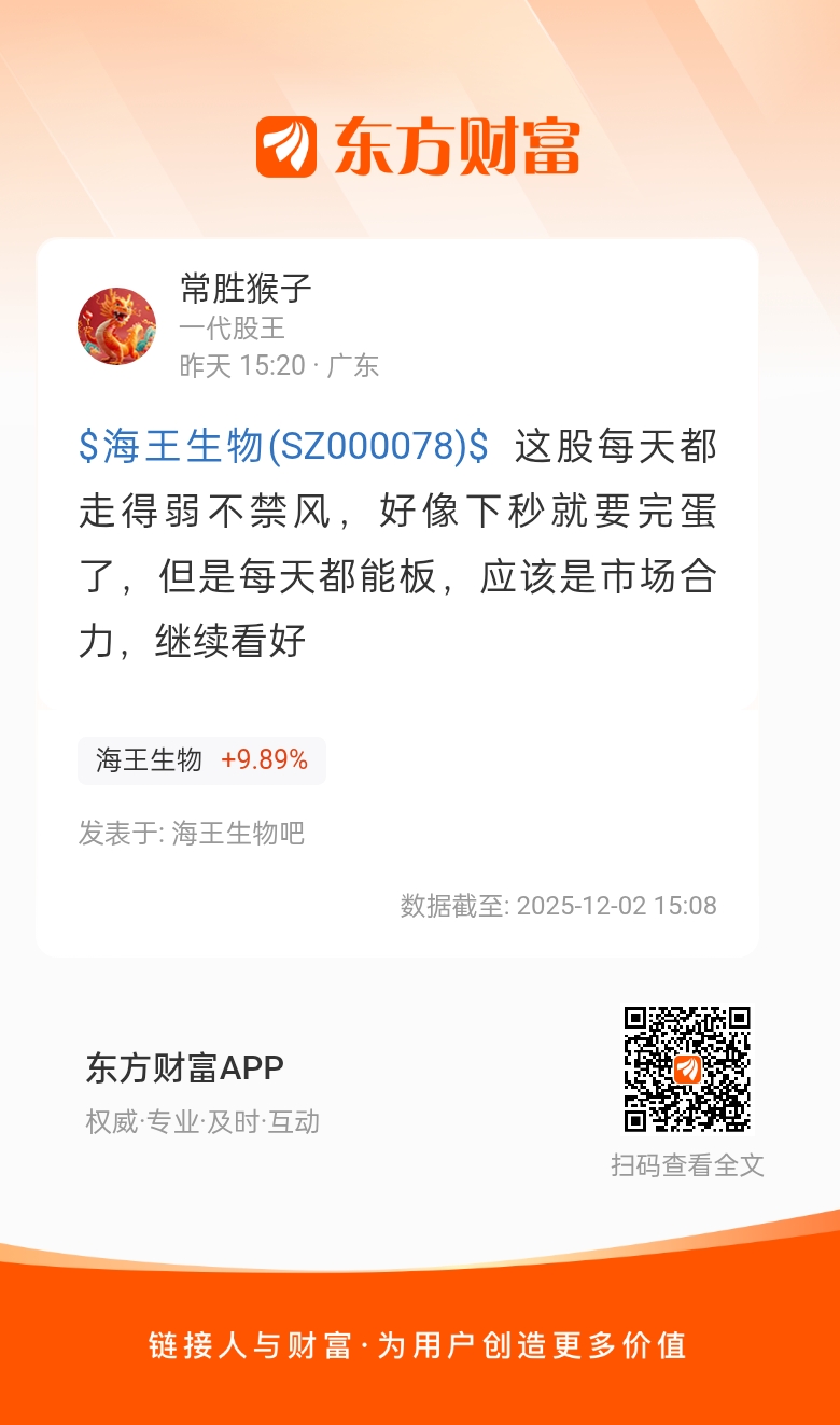 $海王生物(SZ000078)$  这股每天都走得弱不禁风,好像下秒就要完蛋了,但是每天都能板,应该是市场合力,继续看好