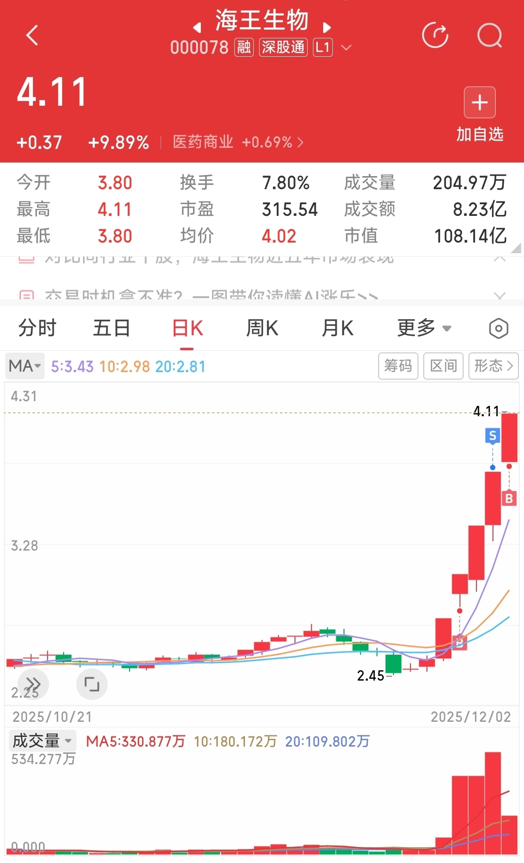 $海王生物(SZ000078)$ 对于昨天的S,到现在为止,我依然认为是没毛病的,它昨天的开盘以及分时走势,我都认为只有卖点,没有买点;不过今天它给出了信号,我便毫不犹豫的B了它,综上所述这波操作是合理的,并非纠错!