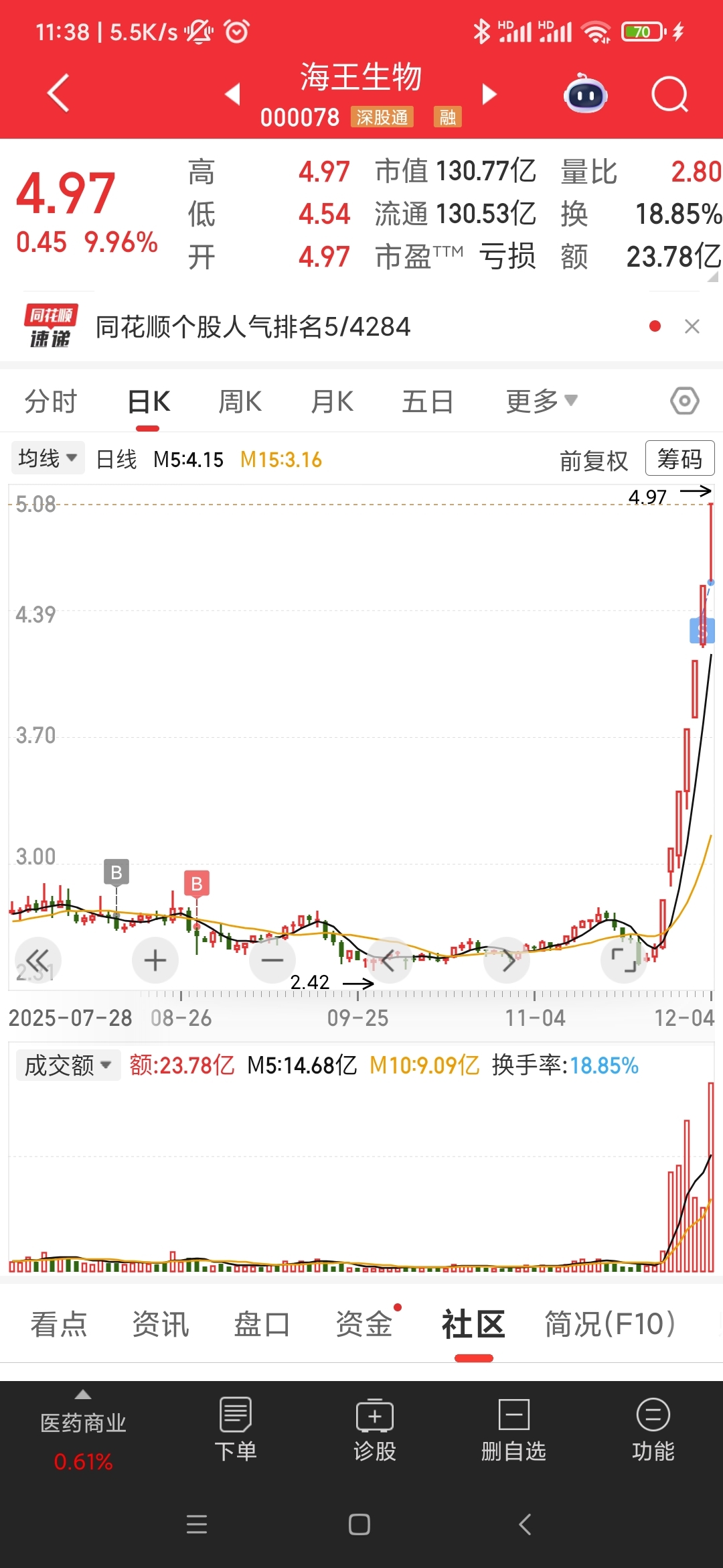 $海王生物(SZ000078)$ 今天卖了2/3,按原始仓位算,正好翻倍,留一点陪大家