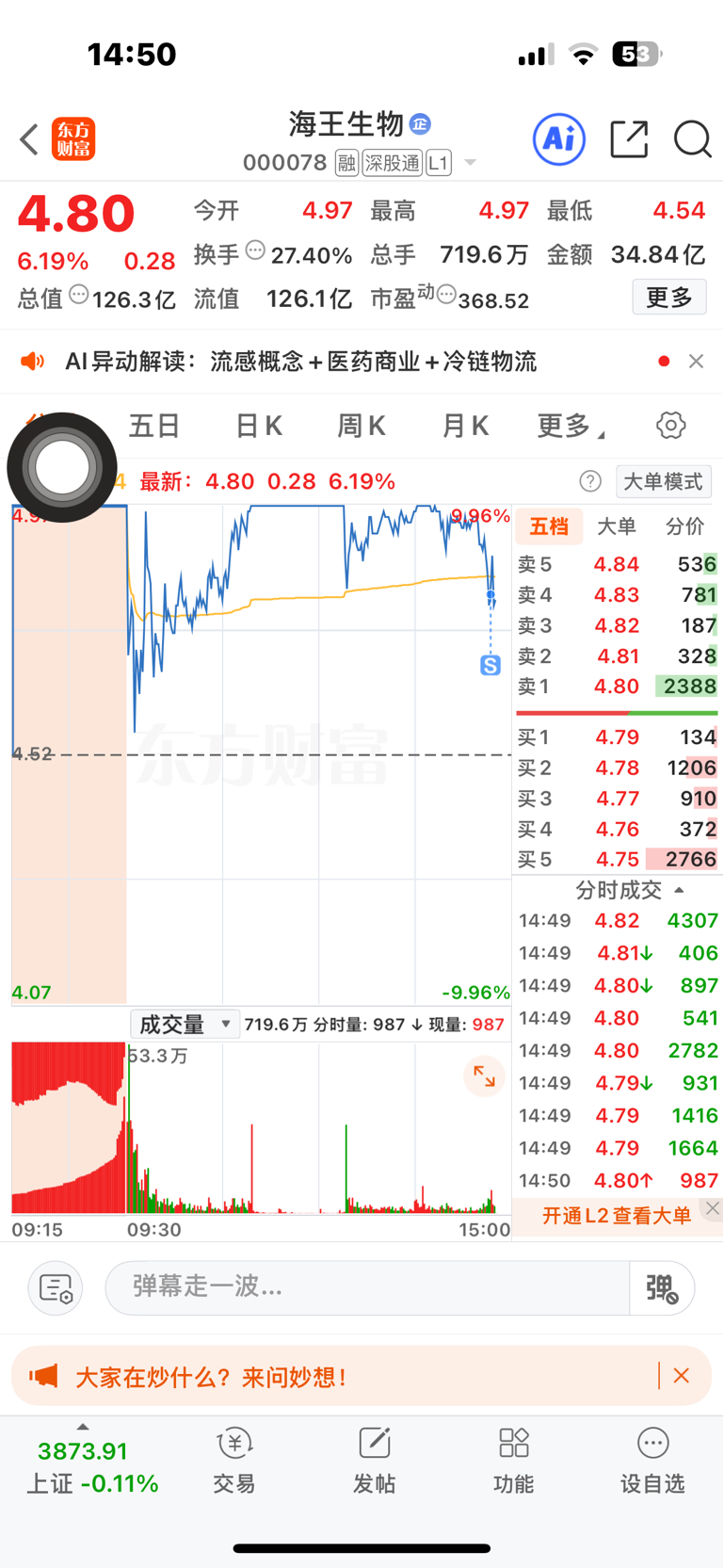 $海王生物(SZ000078)$ 走了,等明天再看啥情况