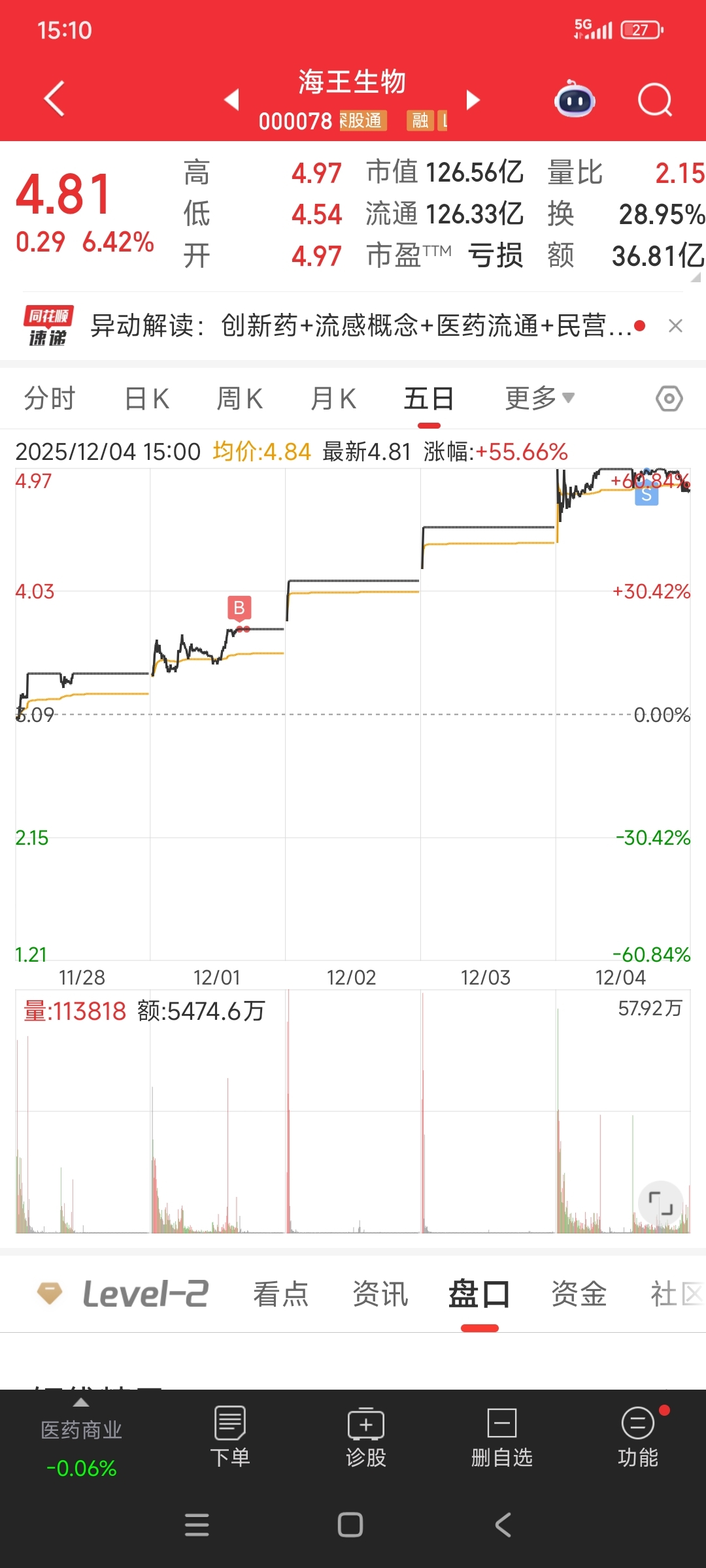 $海王生物(SZ000078)$ 还以为卖飞了,生半天闷气,还好跌下来了舒缓一点了