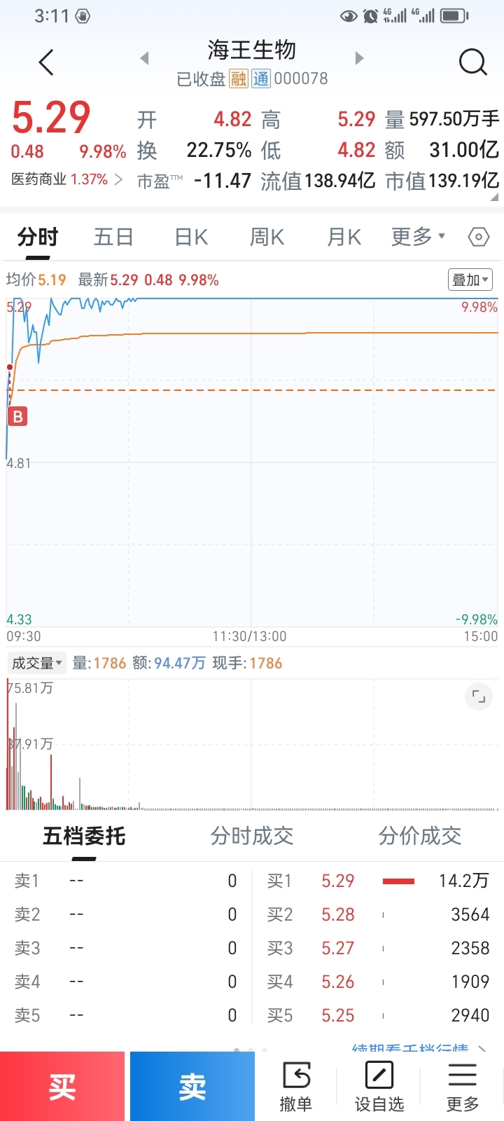 $海王生物(SZ000078)$ 昨天卖了,今天又追进来了,周一兄弟们千万别核我