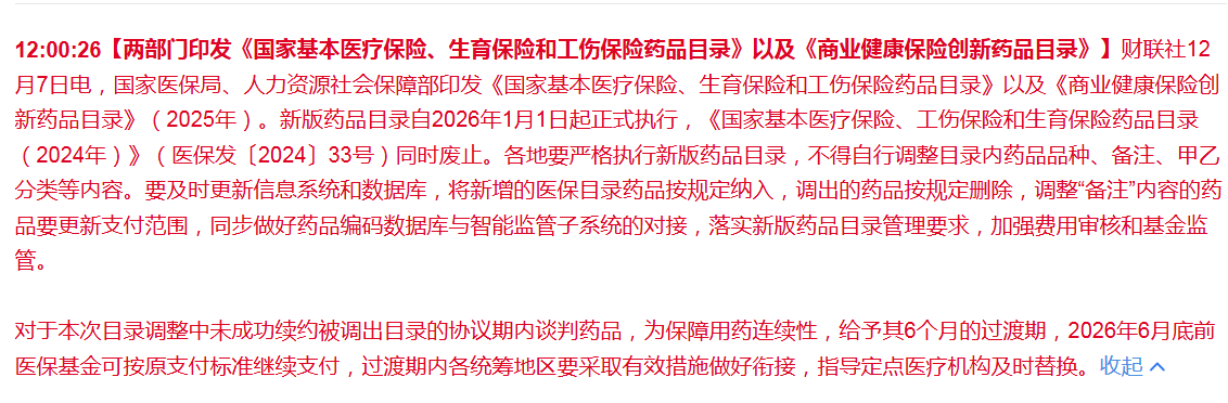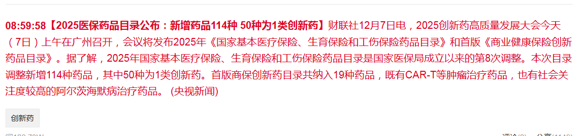 【两部门:积极推动商保创新药目录纳入商业健康保险保障范围】财联社12月7日电,国家医保局、人力资源社会保障部印发《国家基本医疗保险、生育保险和工伤保险药品目录》以及《商业健康保险创新药品目录》(2025年)。其中提出,积极推动商保创新药目录纳入商业健康保险保障范围。各地医保部门要会同有关部门推动多层次医疗保障体系建设,积极支持普惠型商业健康保险发展,商保创新药目录推荐商业健康保险、医疗互助等多层次医疗保障体系参考使用。支持商保机构根据商保创新药目录设计新产品、更新赔付范围、调整赔付方式,更好满足患者用药需求,切实减轻患者医疗费用负担。鼓励有条件的地区探索开展医保、工伤保险与商保“一站式”结算。