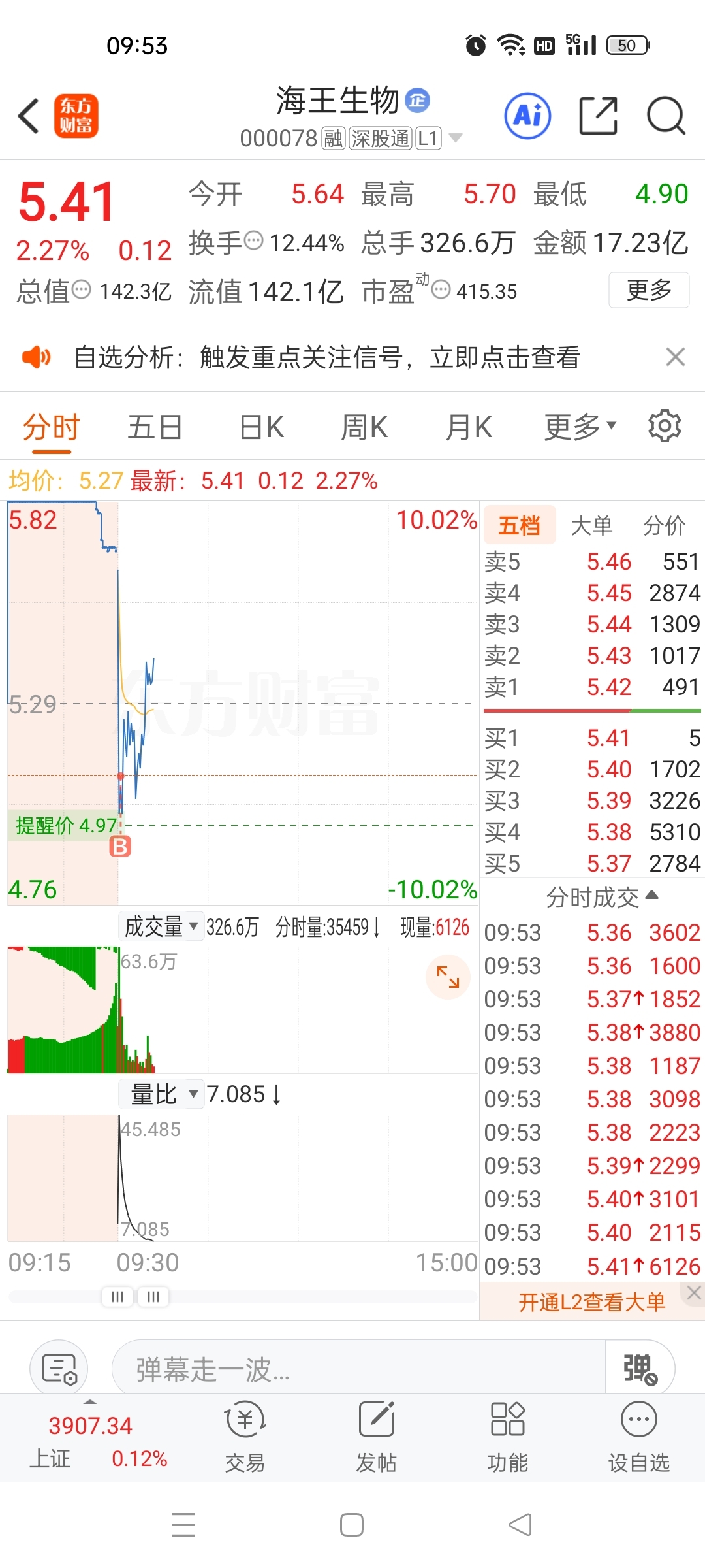 $海王生物(SZ000078)$ 今天来搞一把短线,错过了一次机会还是要搞一下