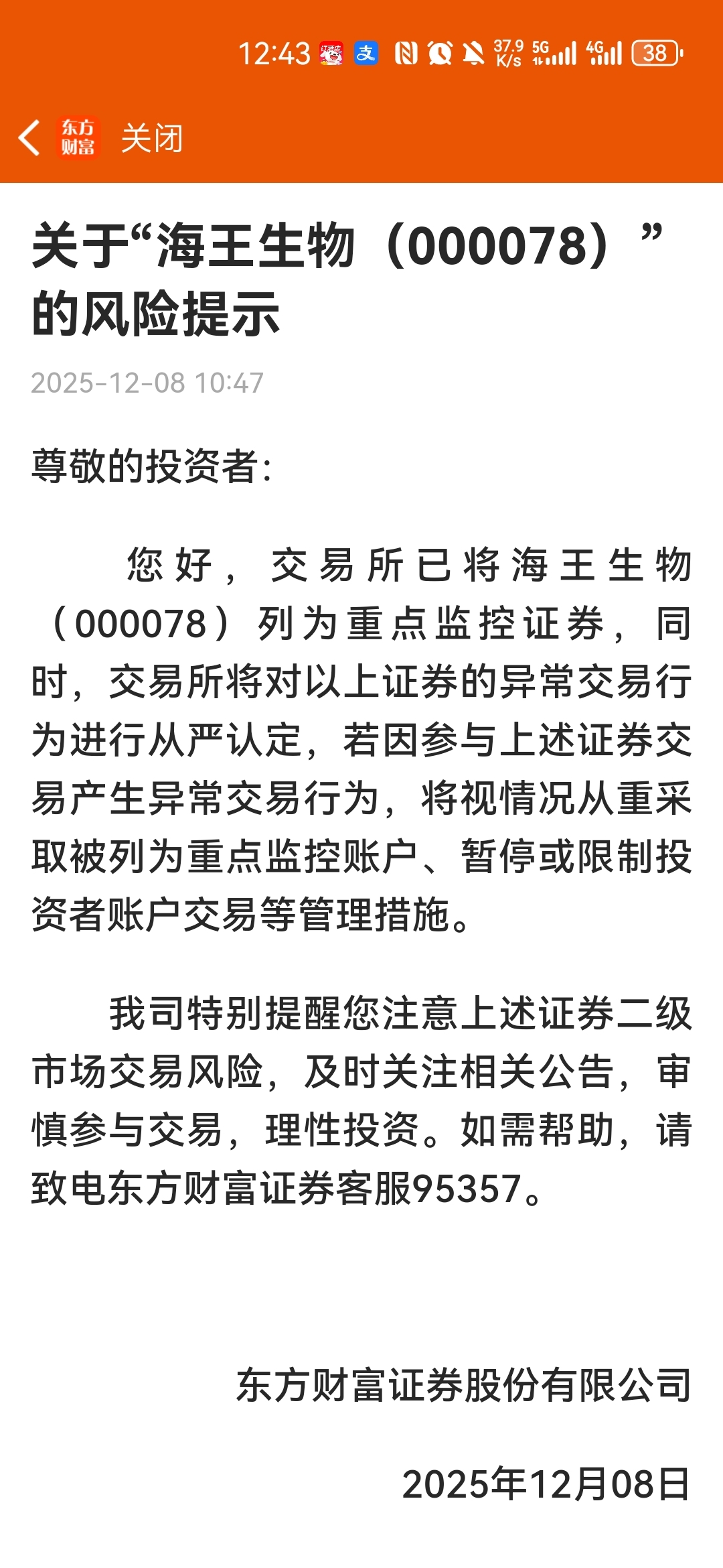 $海王生物(SZ000078)$ 要跌一下,因为有异常提示了,如果一直涨,那不是一件好事
