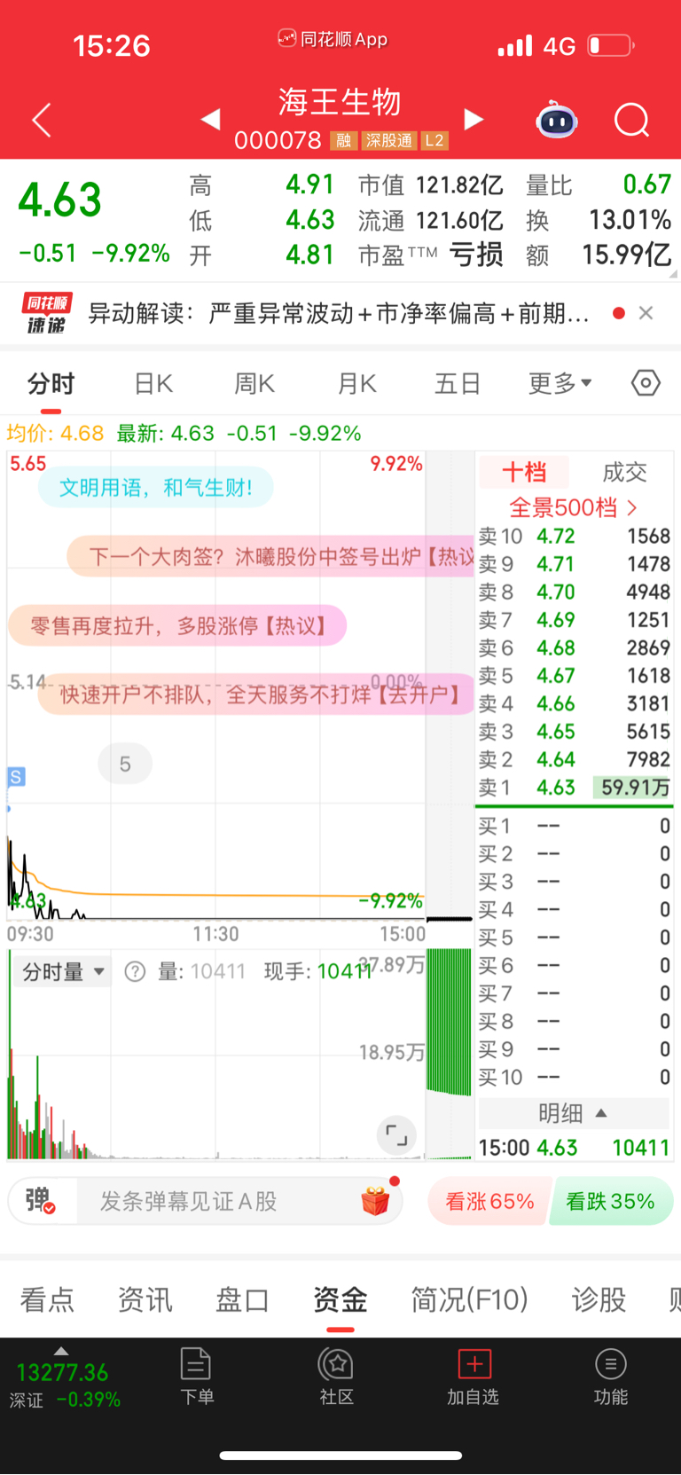 $海王生物(SZ000078)$ 早上一冲立马就按掉,今天低开这么多,没有任何一点反核逻辑,个人建议,没货的明天也不要去。现在监管,昨天套了40亿资金在上面。散户合力是核不动的,明天会冲高,但是是离场的机会