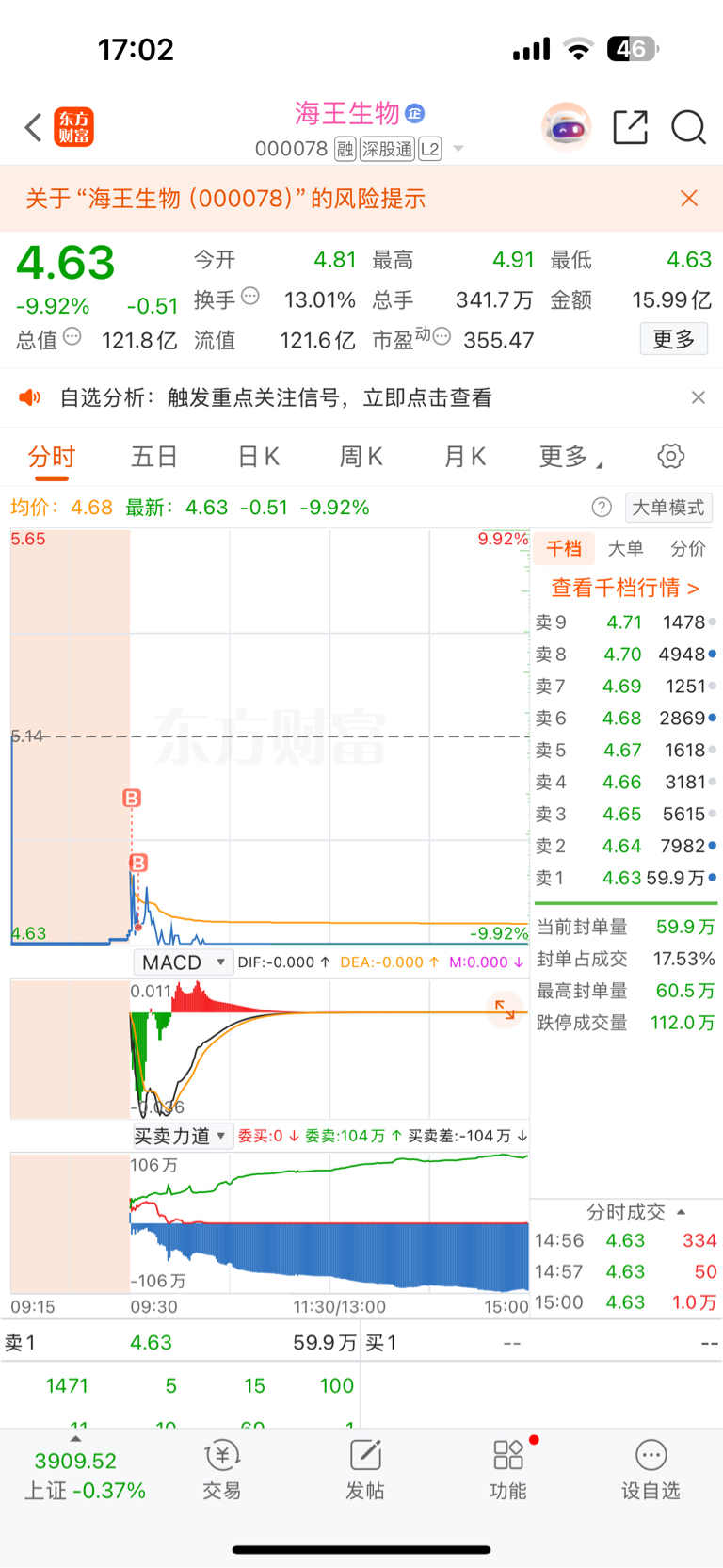 $海王生物(SZ000078)$ 唉,开盘卖出点成买入,后面又补仓