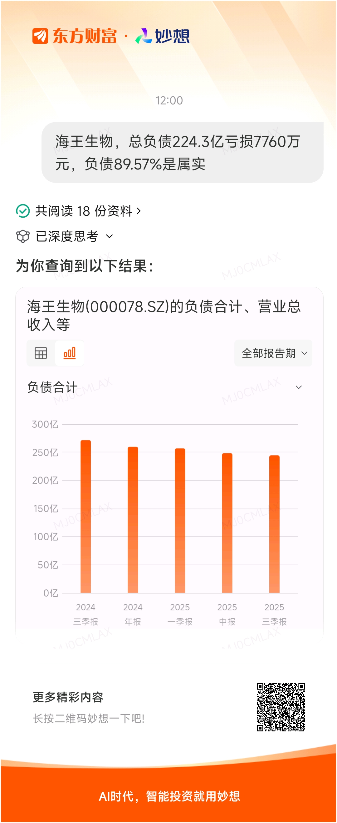 #@妙想,你怎么看?#  妙想一下:海王生物,总负债224.3亿亏损7760万元,负债89.57%是属实