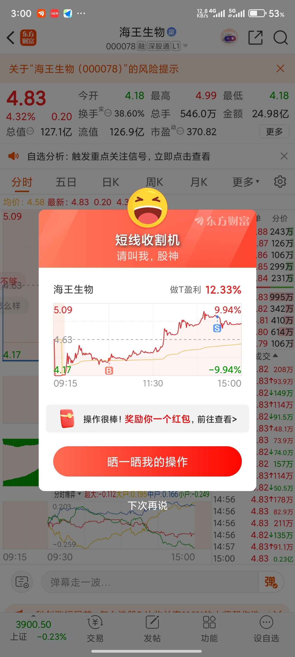 $海王生物(SZ000078)$ 操作对了,资金少了。郁闷