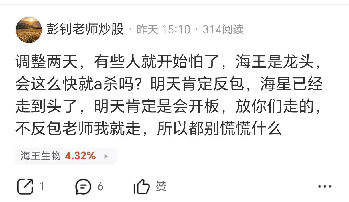 $海王生物(SZ000078)$ 昨天老师就说了,今天肯定是反包的,抄底的话都赚了十几个点了,所以不要整天在那恐慌,明天继续看好