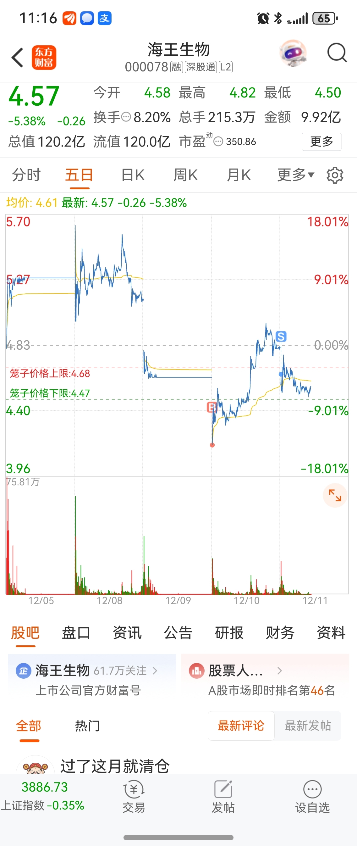 $海王生物(SZ000078)$ 昨天4.18进的,今天盘中4.65跑了,咋感觉跑快了,搞不好下午还会拉红