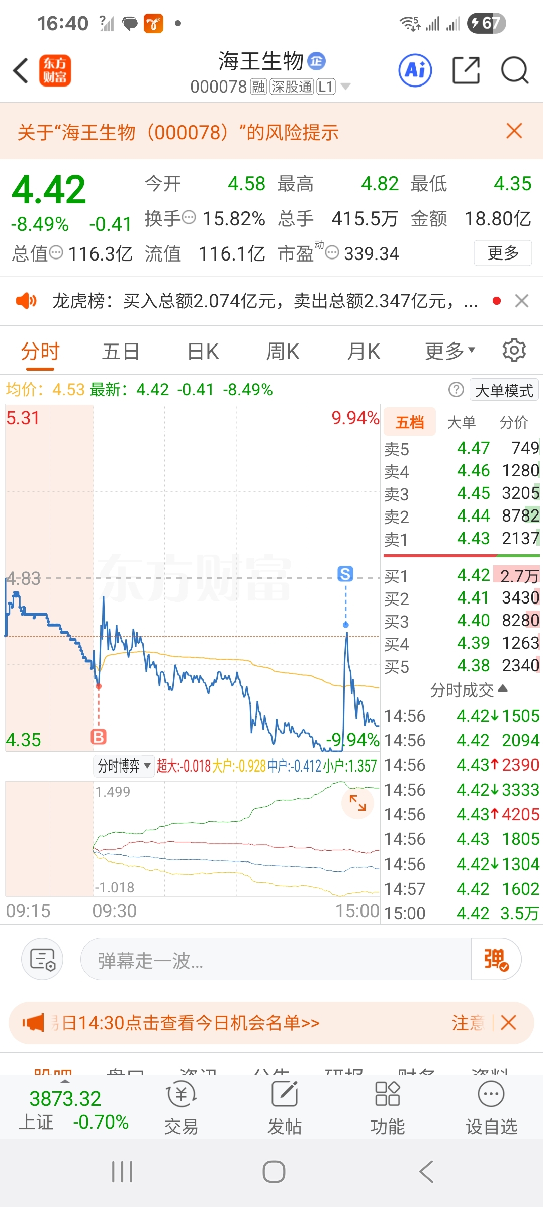 $海王生物(SZ000078)$ 我真的掉,还能卖在空中了