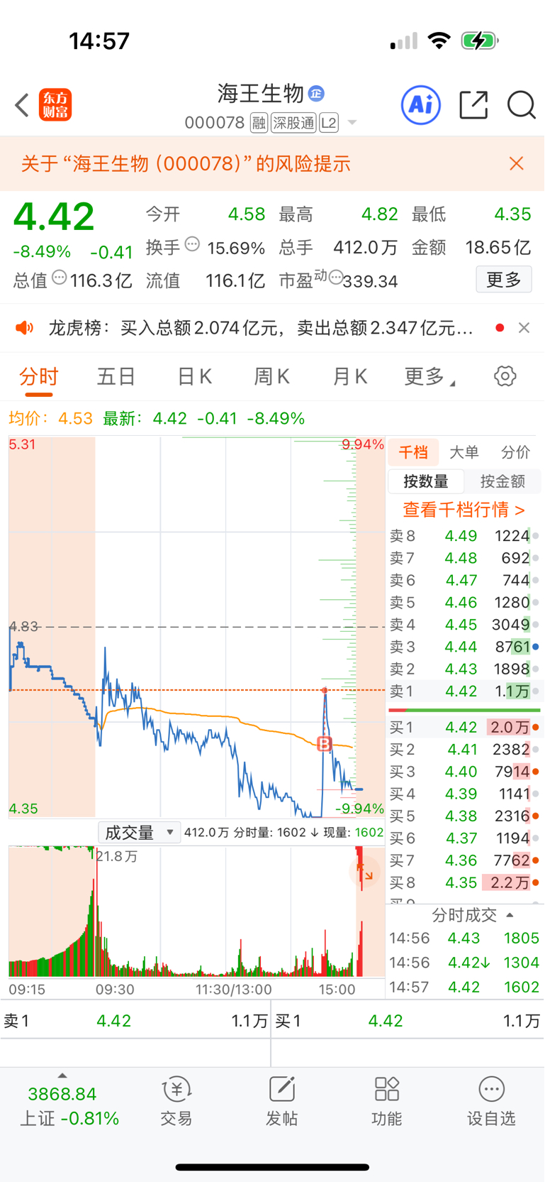 就说我牛逼不牛逼吧,冒着风险提示,卖了其他的票买在最高位,整个操作1分钟左右,进来就先亏4W