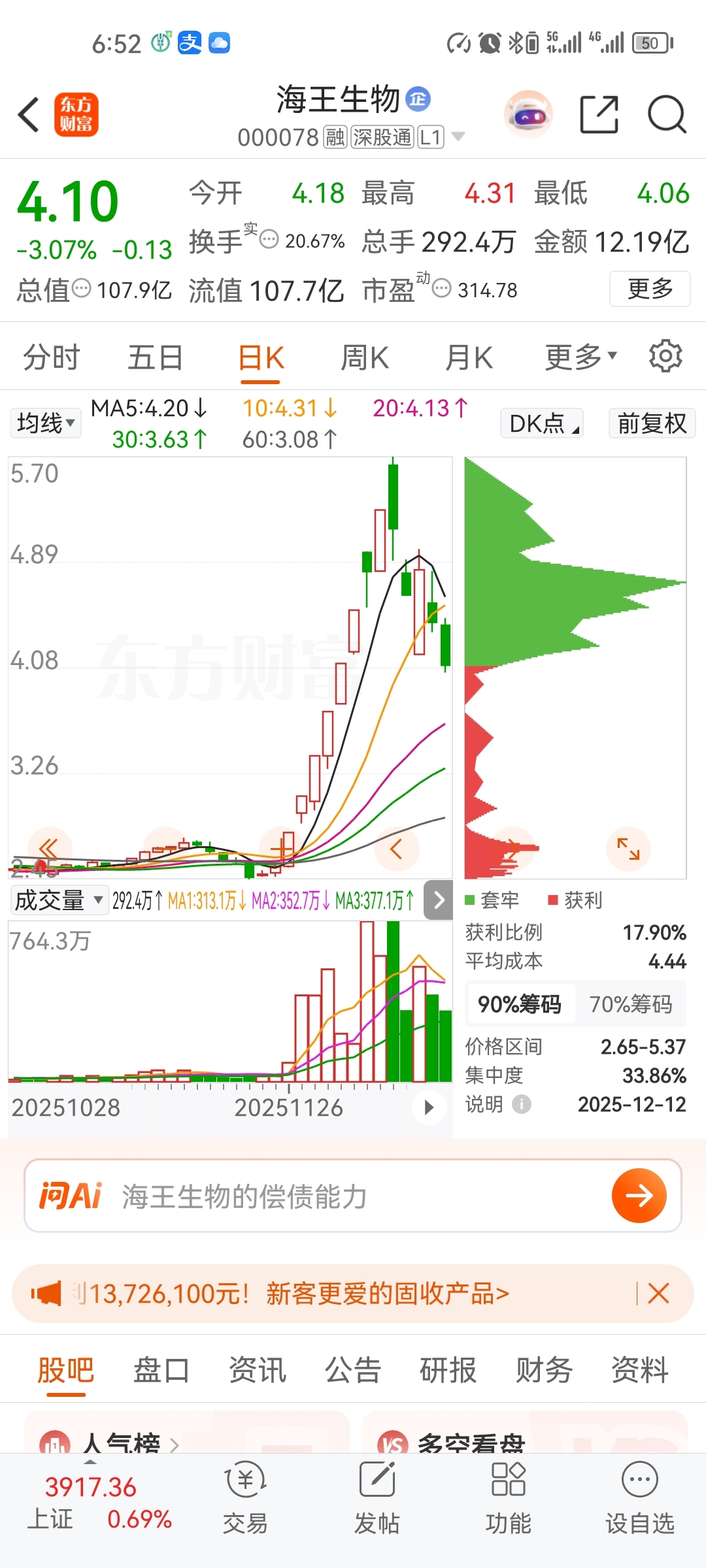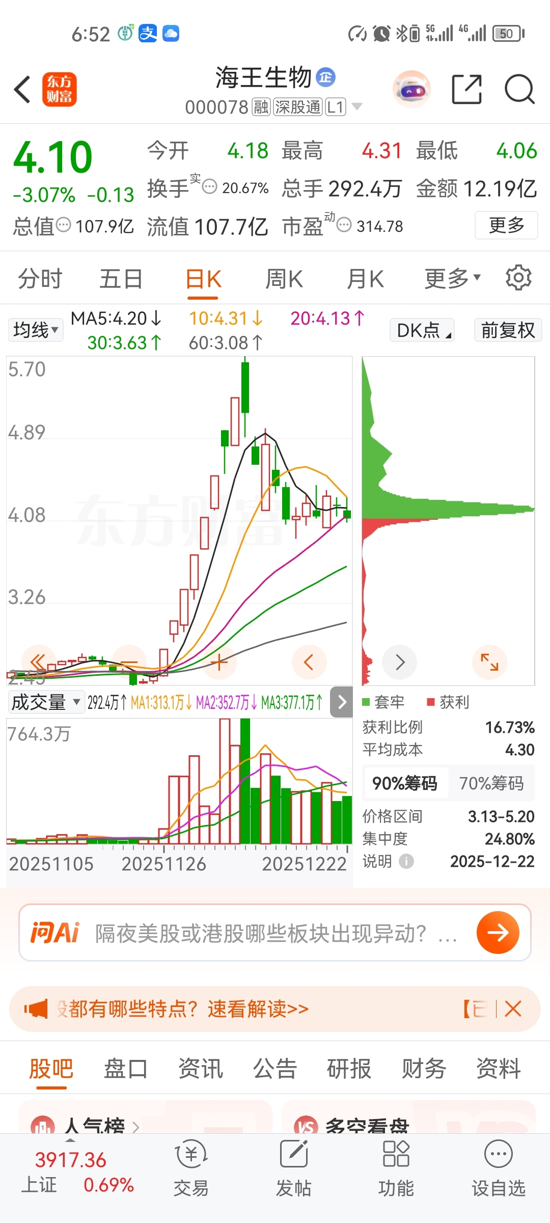 海王生物现在就是典型的横盘出货的状态,每天价格波动不大,但成交量却不见少,下面的筹码每天少点,等过两天下面的筹码没有了,直接一个跌停全部挂山上,别不相信。持仓的赶紧跑路,晚了就要被埋了