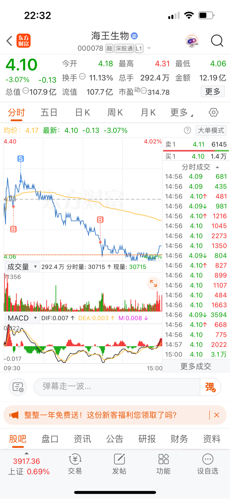 $海王生物(SZ000078)$ 打到成本钱了,明天跑不跑
