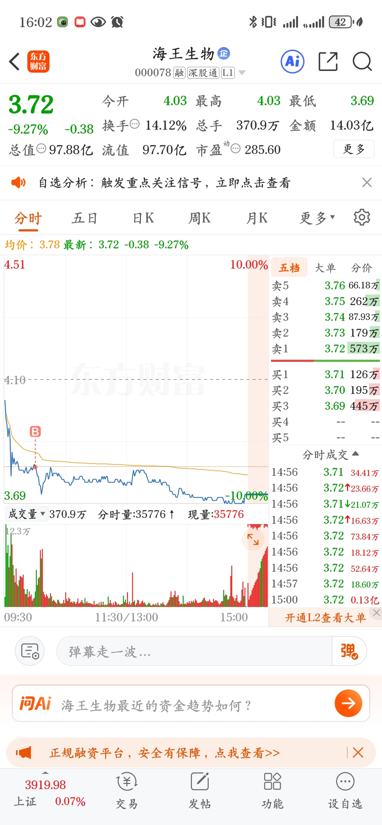 $海王生物(SZ000078)$ 这个点买的都能被套,我真算服了,明天开盘就砸