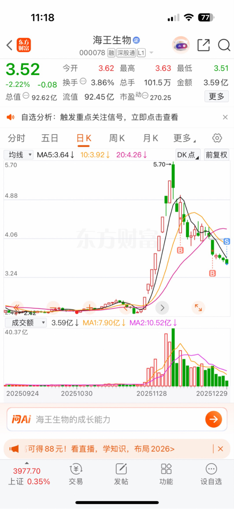 $海王生物(SZ000078)$ 我已经割肉了,亏了16个点,你可以拉升了
