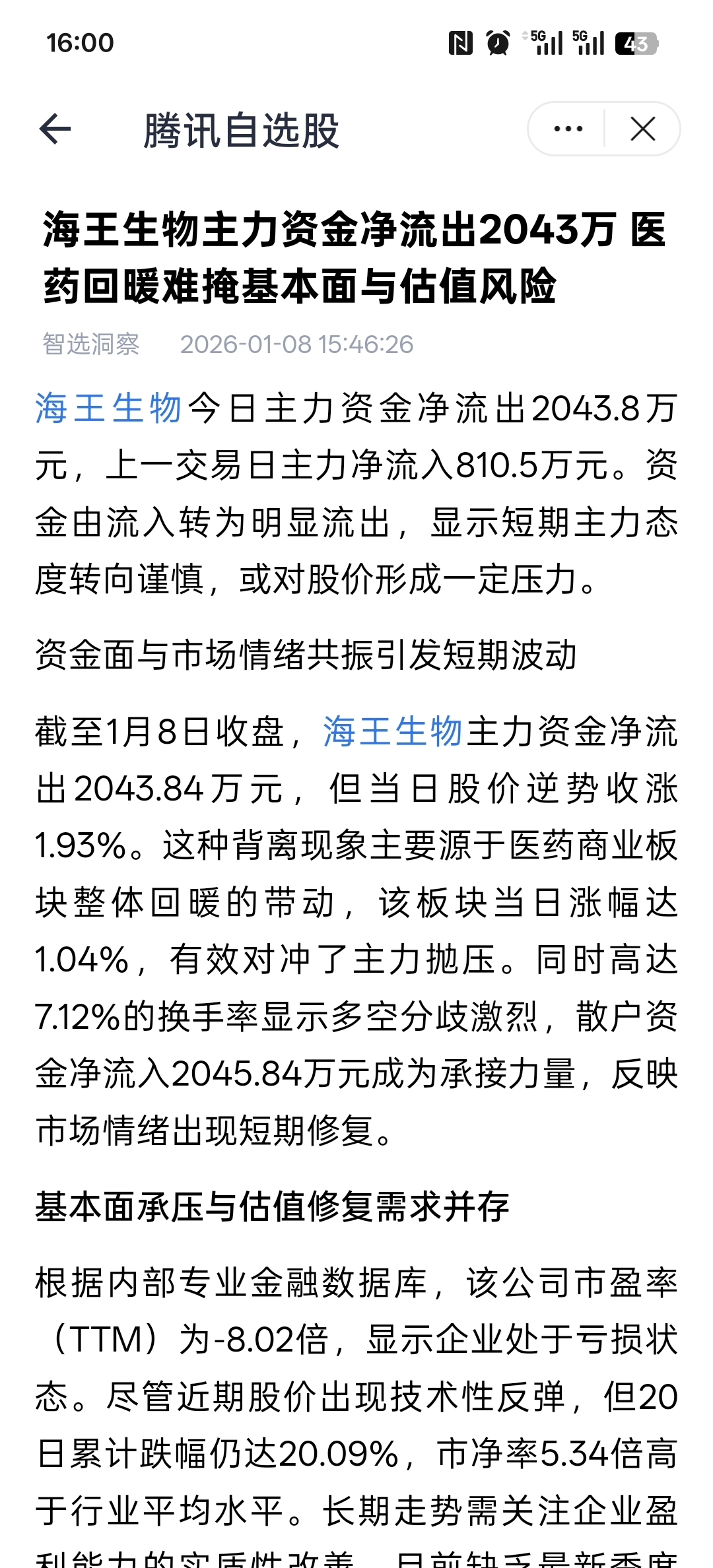 $海王生物(SZ000078)$ 老铁们,今天主力资金净流出,散户资金承接起来的,情况有些不妙