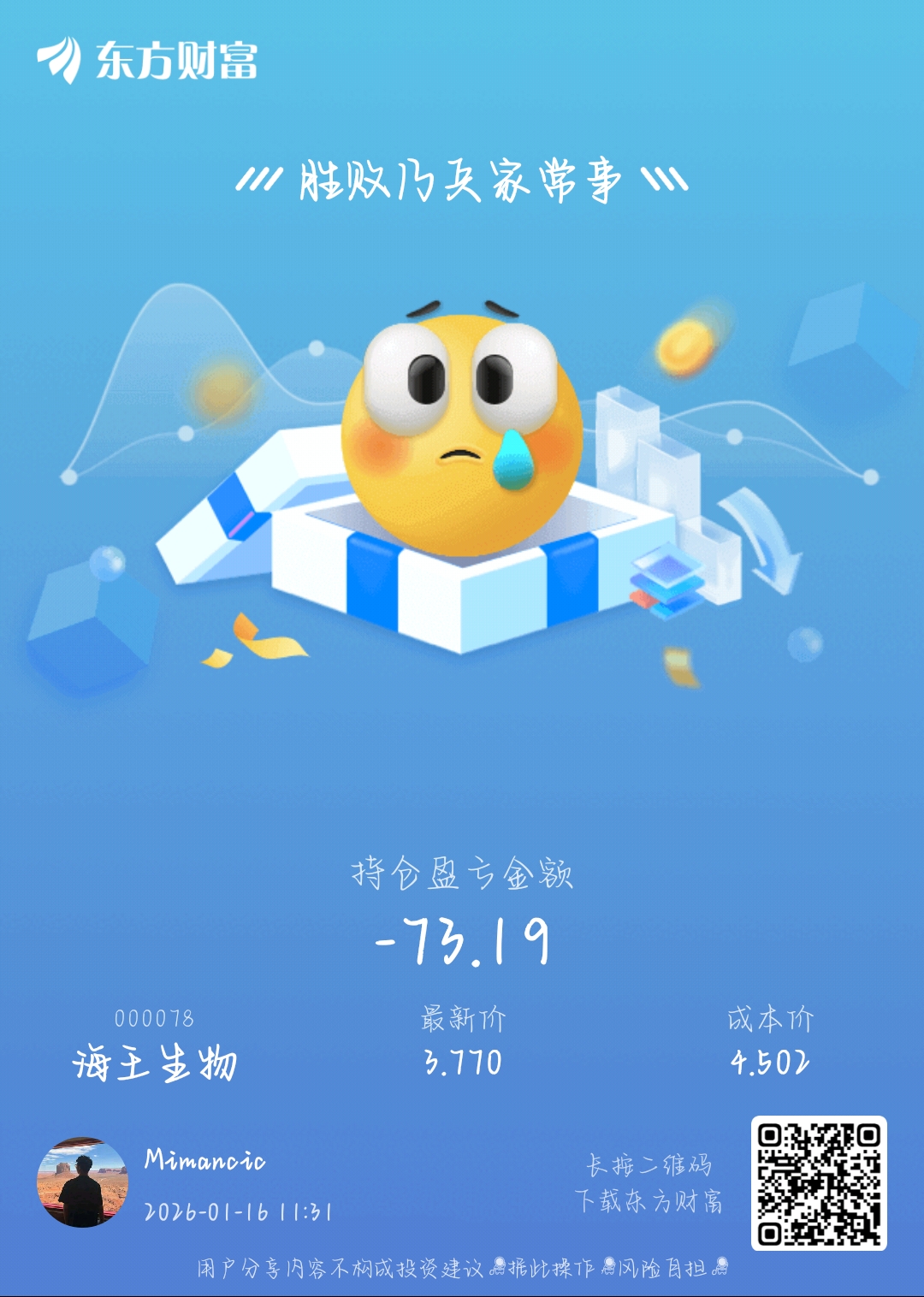 温馨提示: 1.根据《证券法》规定,禁止编造、传播虚假信息或者误导性信息,扰乱证券市场;2.用户在本社区发表的所有资料、言论等仅代表个人观点,与本网站立场无关,不对您构成任何投资建议。用户应基于自己的独立判断,自行决定证券投资并承担相应风险。《东方财富社区管理规定》