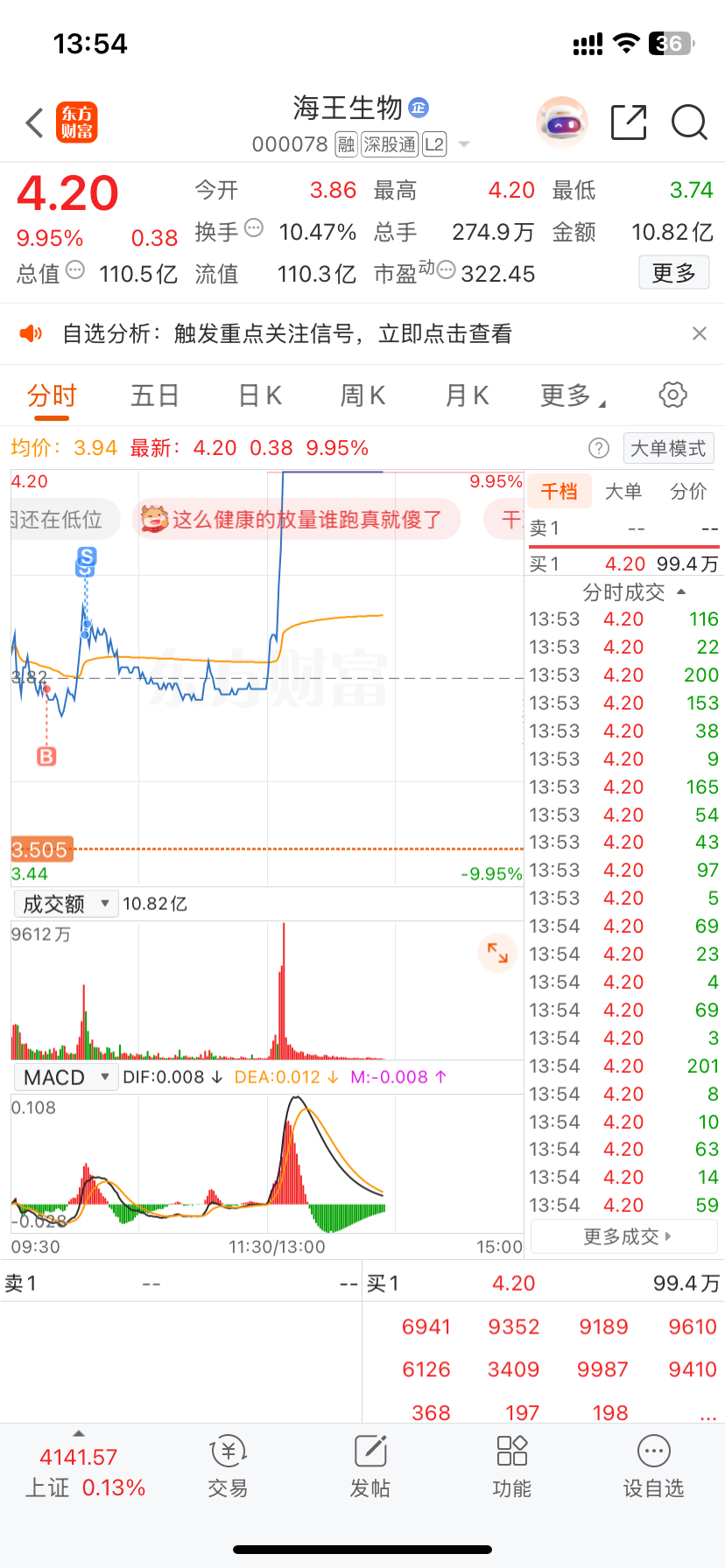 $海王生物(SZ000078)$ 下午没给机会接回来啊
