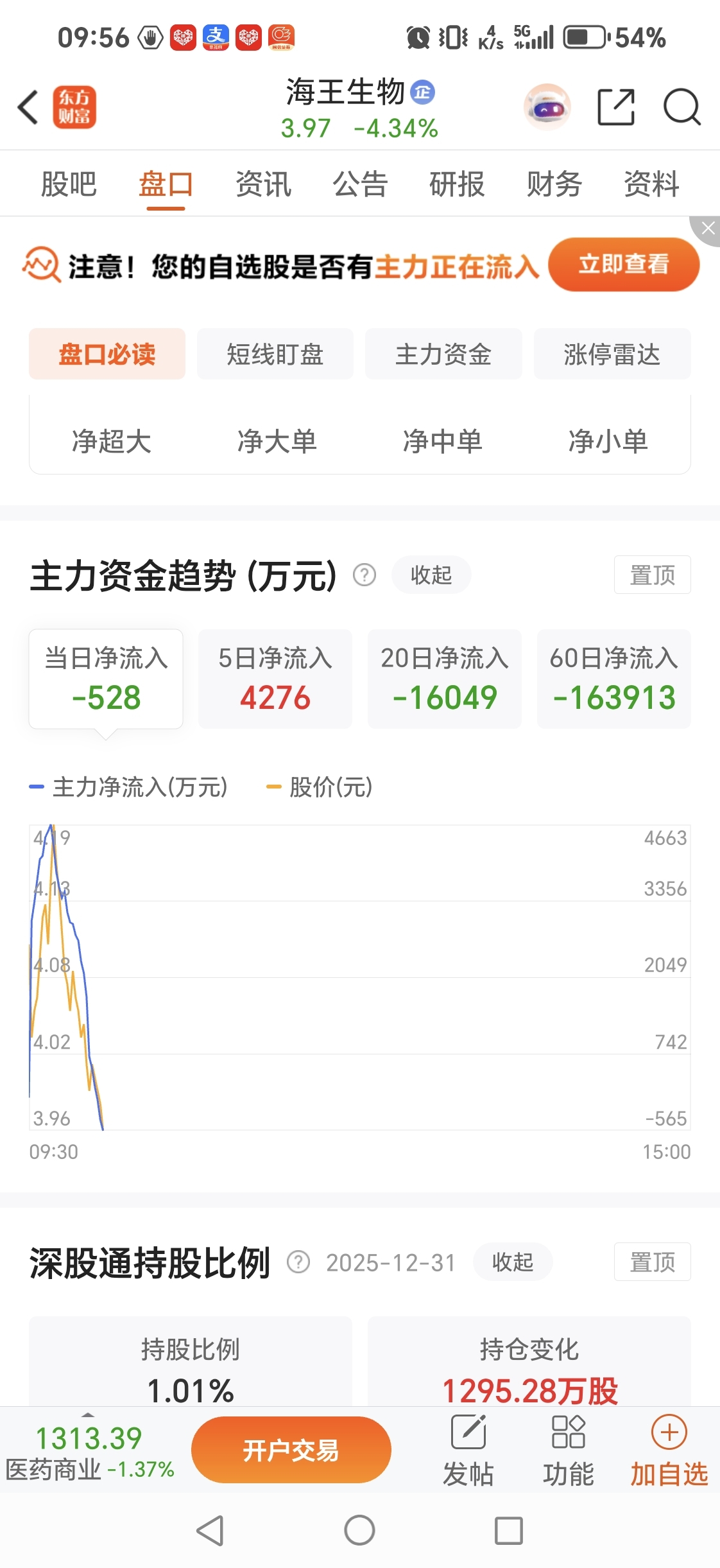 $海王生物(SZ000078)$ 主力出货出疯了,手贱早盘进来,六个点大面跑不了了,说不定跌停,主力出货太坚决,没有一点犹豫