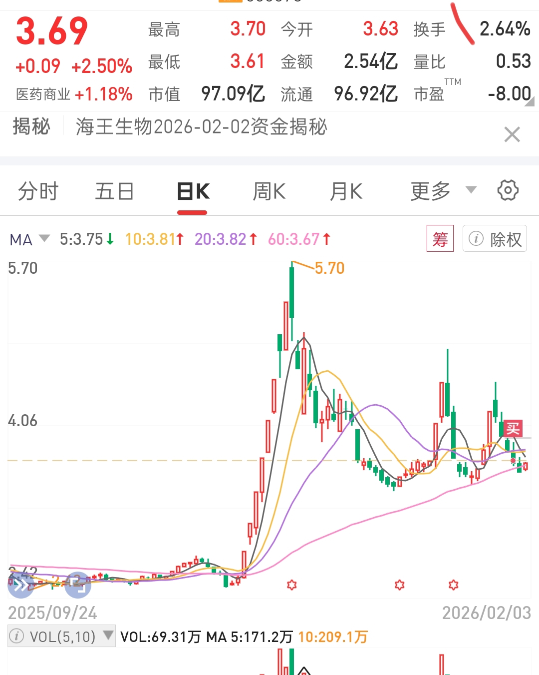 海王生物,从技术上分析,在60日均线处有支撑,会反弹。盯住大盘,只要大盘不倒,反