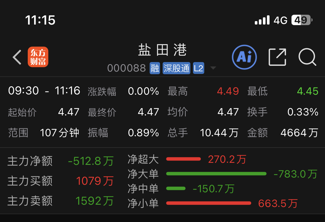 $盐 田 港(SZ000088)$ 主力资金净流出