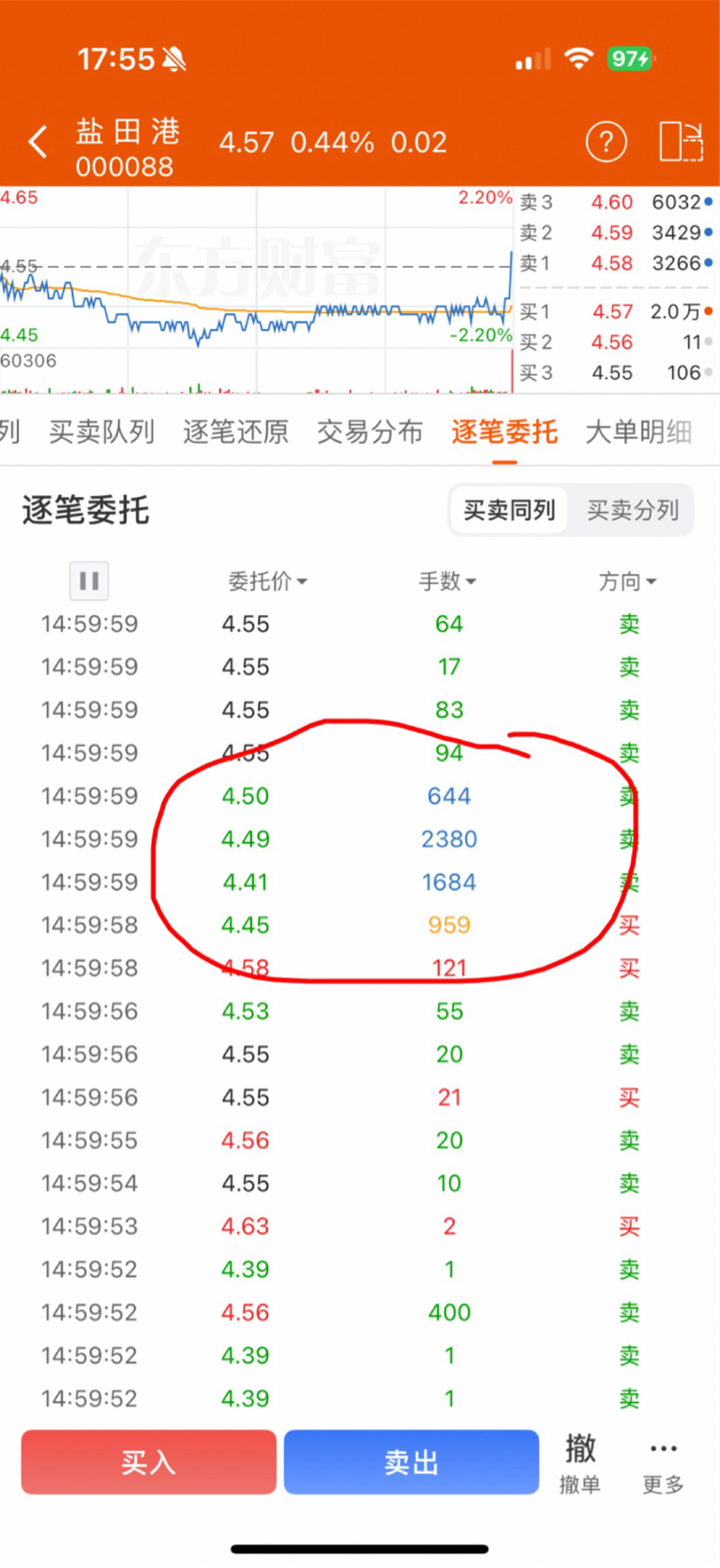 $盐 田 港(SZ000088)$ 真羡慕这三个大单砸出去的,下周又可以低价买回,我是今天买的,赚了2.43%,但是不能当天卖出。希望周一待我好点,我就挂个4.59出去,我不贪心