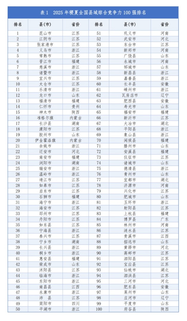 华夏时报消息,12月2日,稷夏全国县域综合竞争力和投资潜力百强县市榜单发布。2025年全国综合竞争力前10强县(市)分别是昆山市、江阴市、张家港市、义乌市、常熟市、晋江市、慈溪市、诸暨市、宜兴市、太仓市。