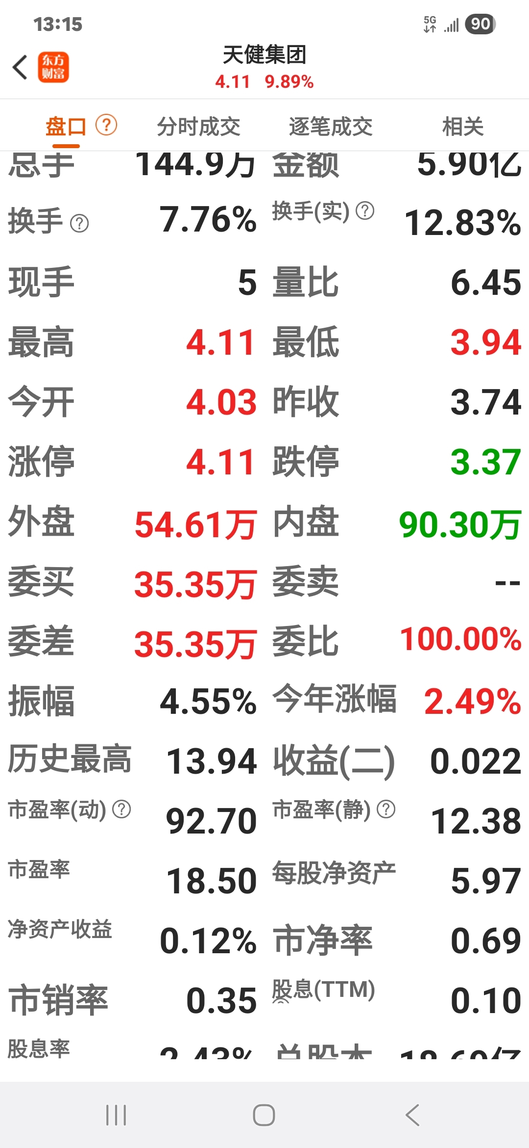 $天健集团(SZ000090)$ 今年涨幅才2.49%,净资产5.97