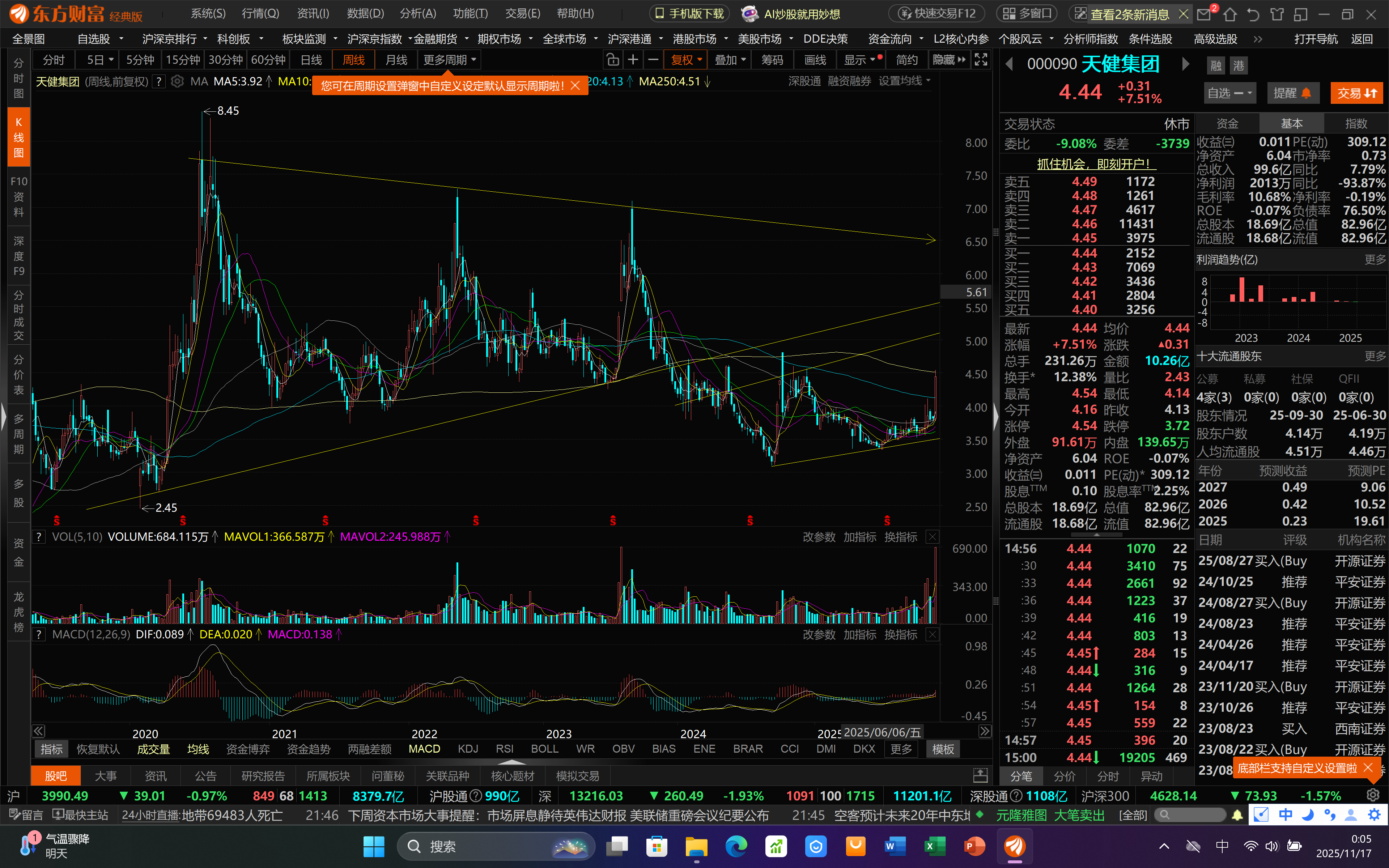 3. 天健集团总体上与大盘相反,中小盘科技股的持续回调,对于天健集团是极为有利的