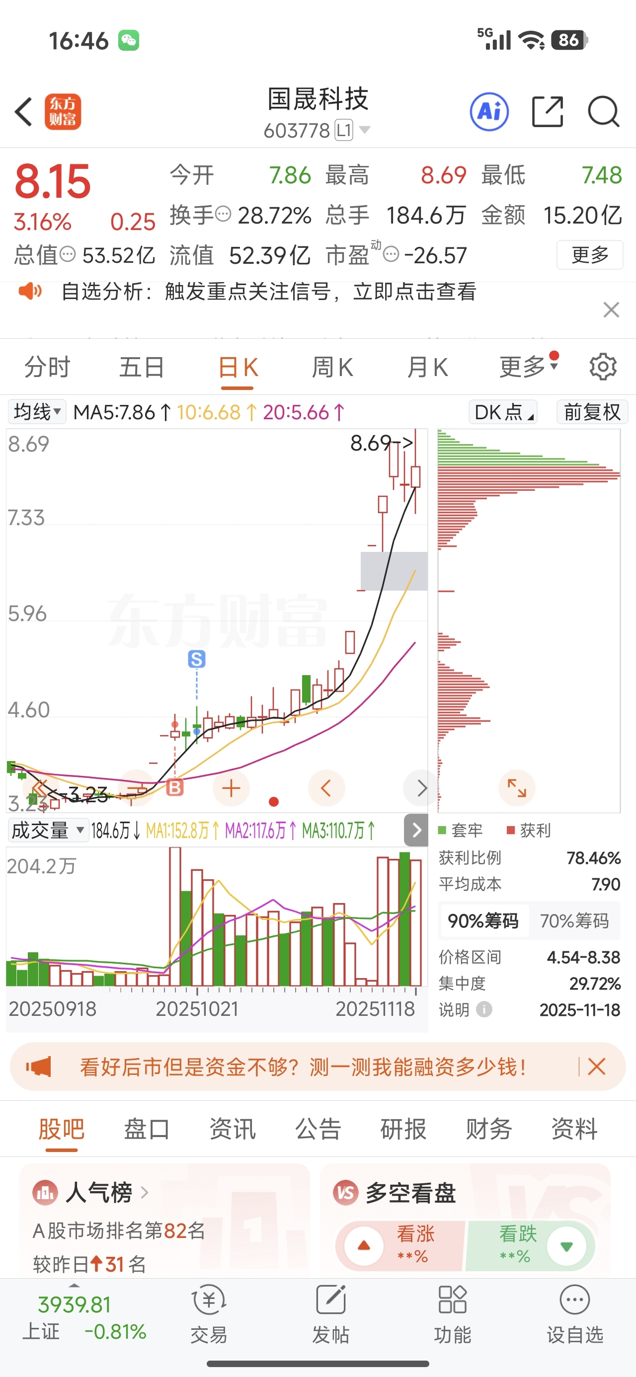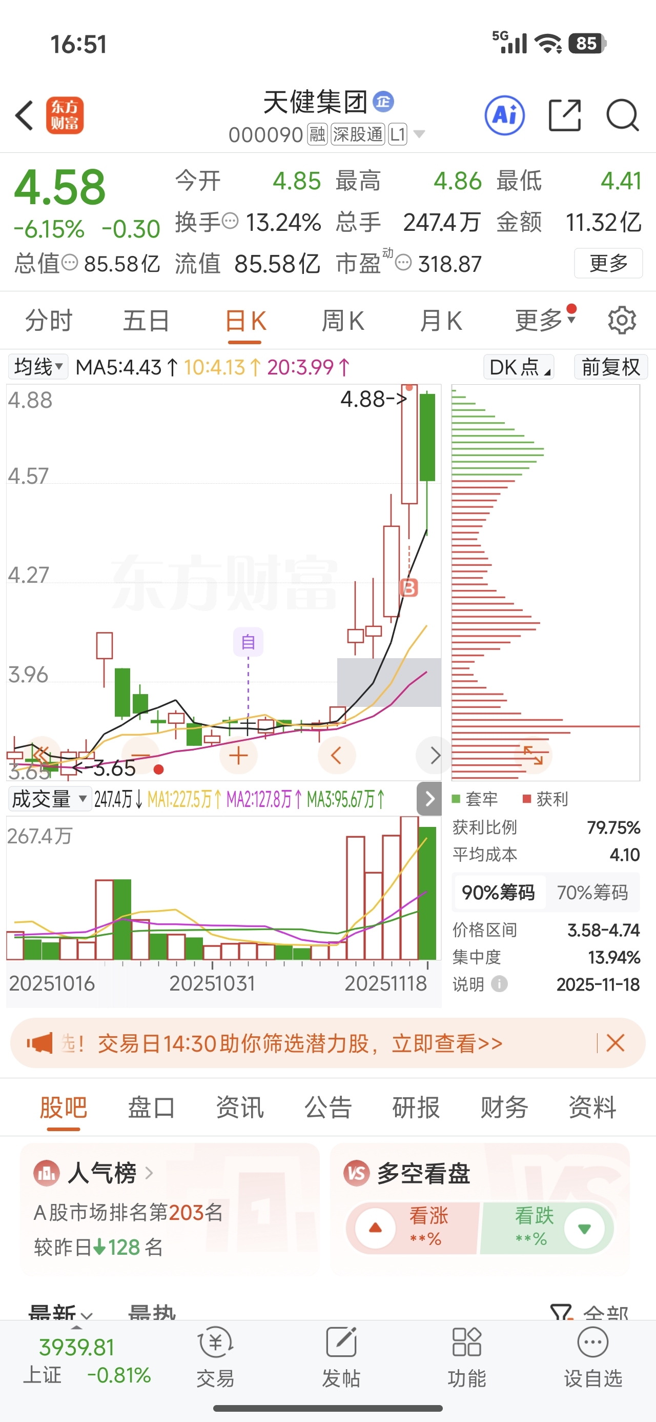 $天健集团(SZ000090)$ 今天大盘不好,看来烂板出妖股,也要看大环境的,今天技术不行,没有做T,开盘没有及时卖出,下午两个冲高没有卖出做T,怕技术不行,算了套几天,之前就卖飞过一个,所以怕了,没办法谁叫我技术不过关了,挨打就要认!