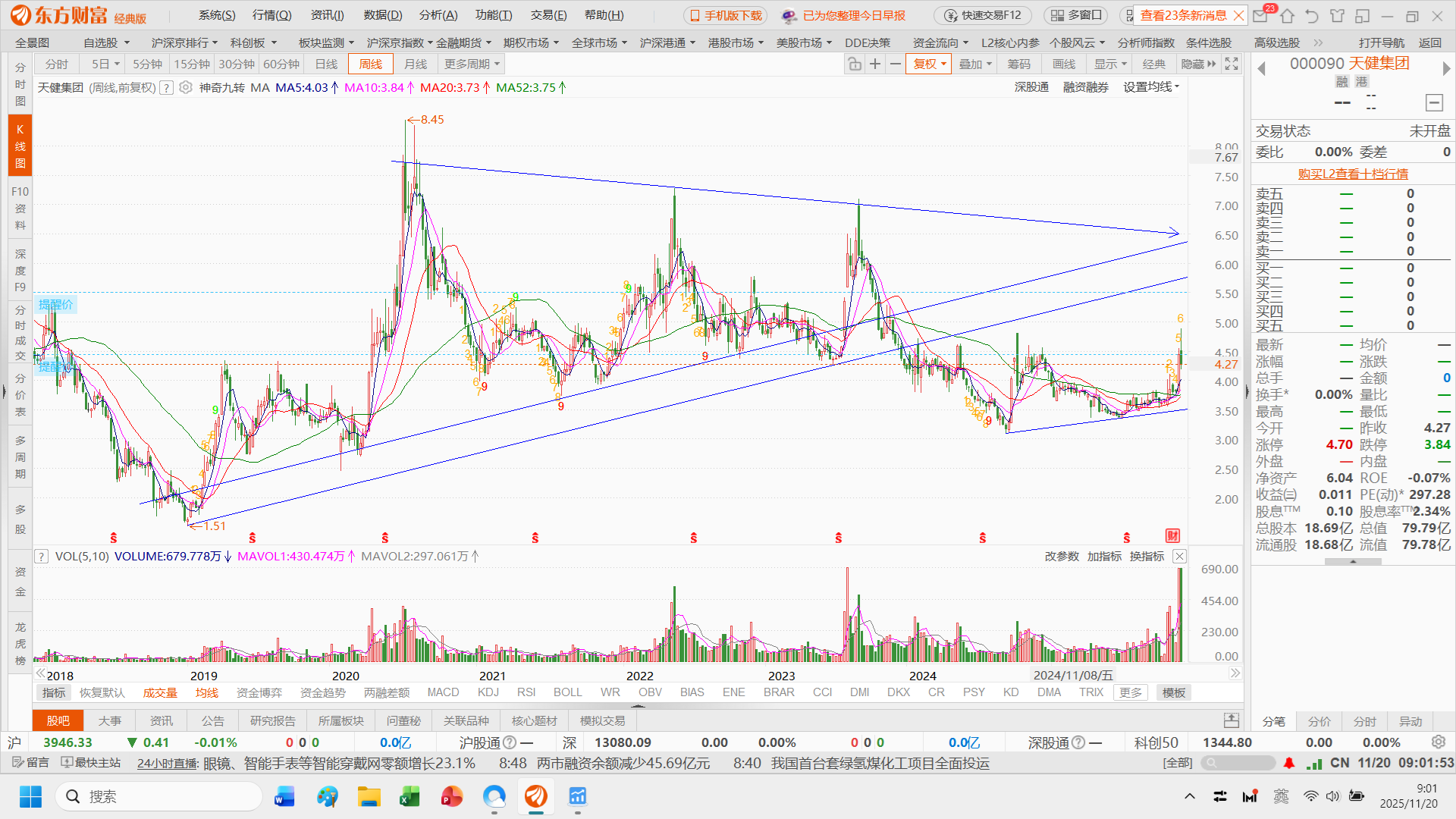 天健集团(000090)周线图,心态平和,拉升初期的洗盘,一目了然。周期越长,格