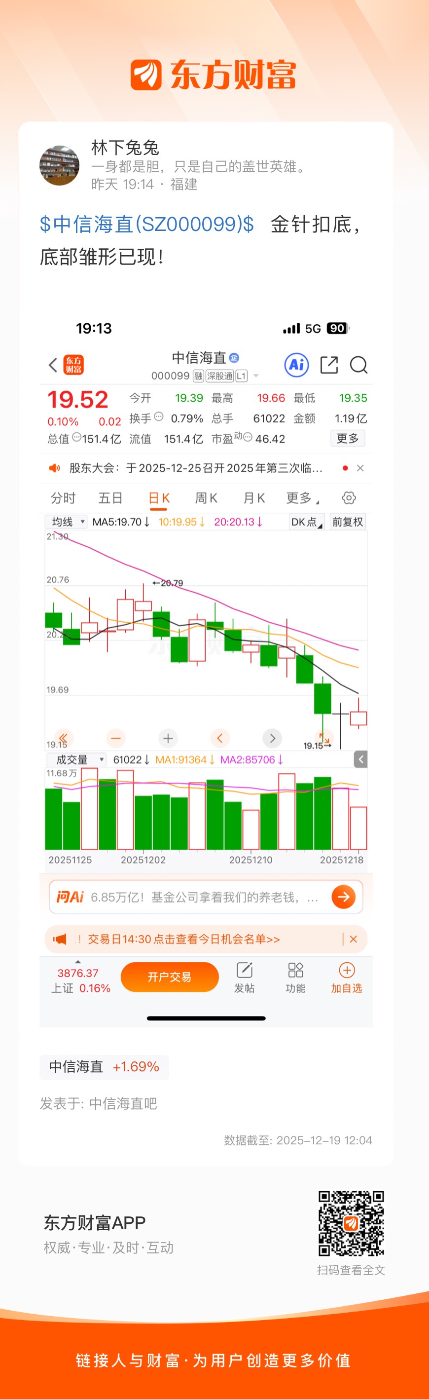 $中信海直(SZ000099)$  金针扣底,底部雏形已现!