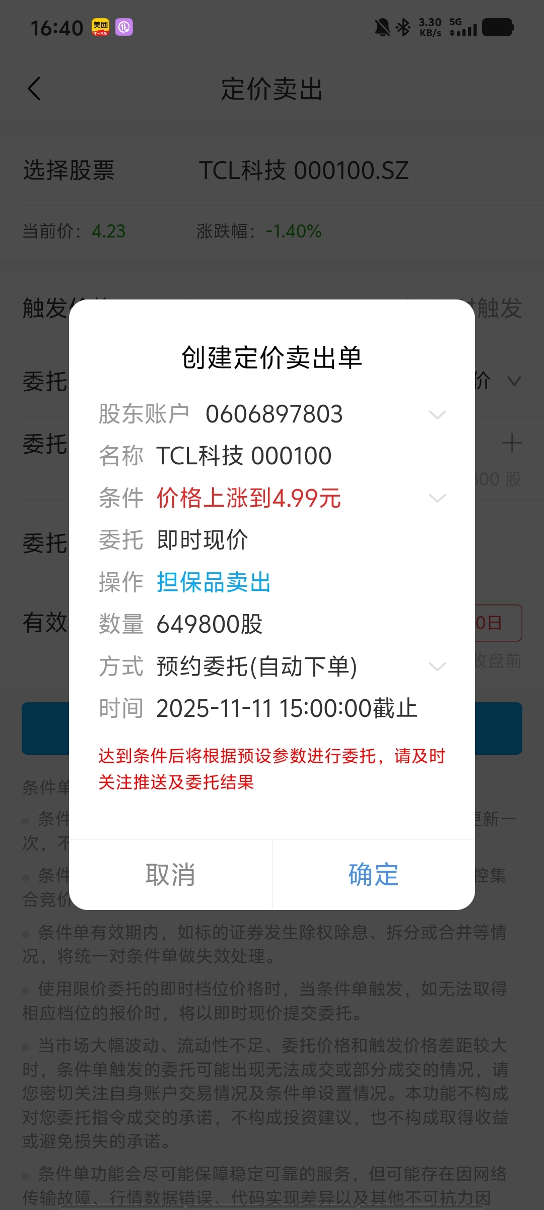 $TCL科技(SZ000100)$ 有人问我超了多少底!均价4.245元,200多万的,权当定增了,如果不到5元,持股不动,一年后再操作,先安排上条件单,说不定哪一天没看盘就到了!!