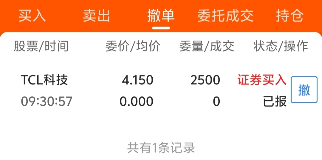 $TCL科技(SZ000100)$ 继续下单,等待下跌,先来1万的!!!每跌5分资金翻倍,严格纪律!!在春天里播种,在秋天里收获,明年见!!