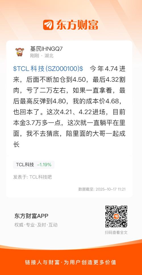 $TCL科技(SZ000100)$ 今年4.74进来,后面不断加仓到4.50,最后4.32割肉,亏了二万左右,如果一直拿着,最后最高反弹到4.80,我的成本价4.68,也回本了。这次4.21、4.22进场,目前本金3.7万多一点,这次就一直躺平在里面,我不去猜底,陪里面的大哥一起成长