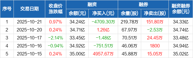 融资方面,当日融资买入1.23亿元,融资偿还1.7亿元,融资净偿还4709.3万元。融券方面,融券卖出167.66万股,融券偿还15.86万股,融券余量219.78万股,融券余额914.26万元。融资融券余额合计34.33亿元。