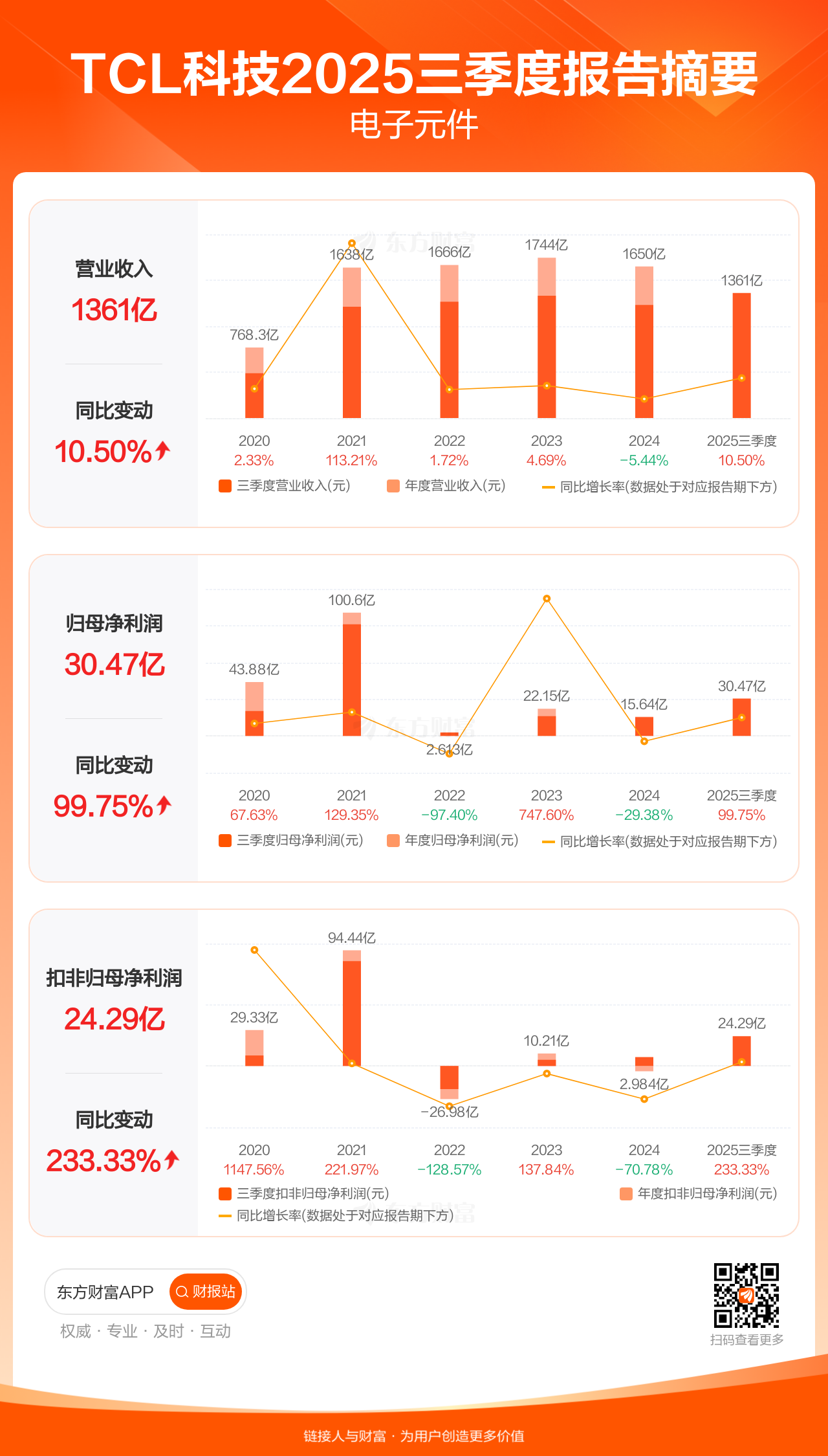 TCL科技10月31日发布2025年三季报显示,公司前三季实现营业收入1360.65亿元,同比增长10.50%;归母净利润30.47亿元,同比增长99.75%;扣非归母净利润24.29亿元,同比增长233.33%。