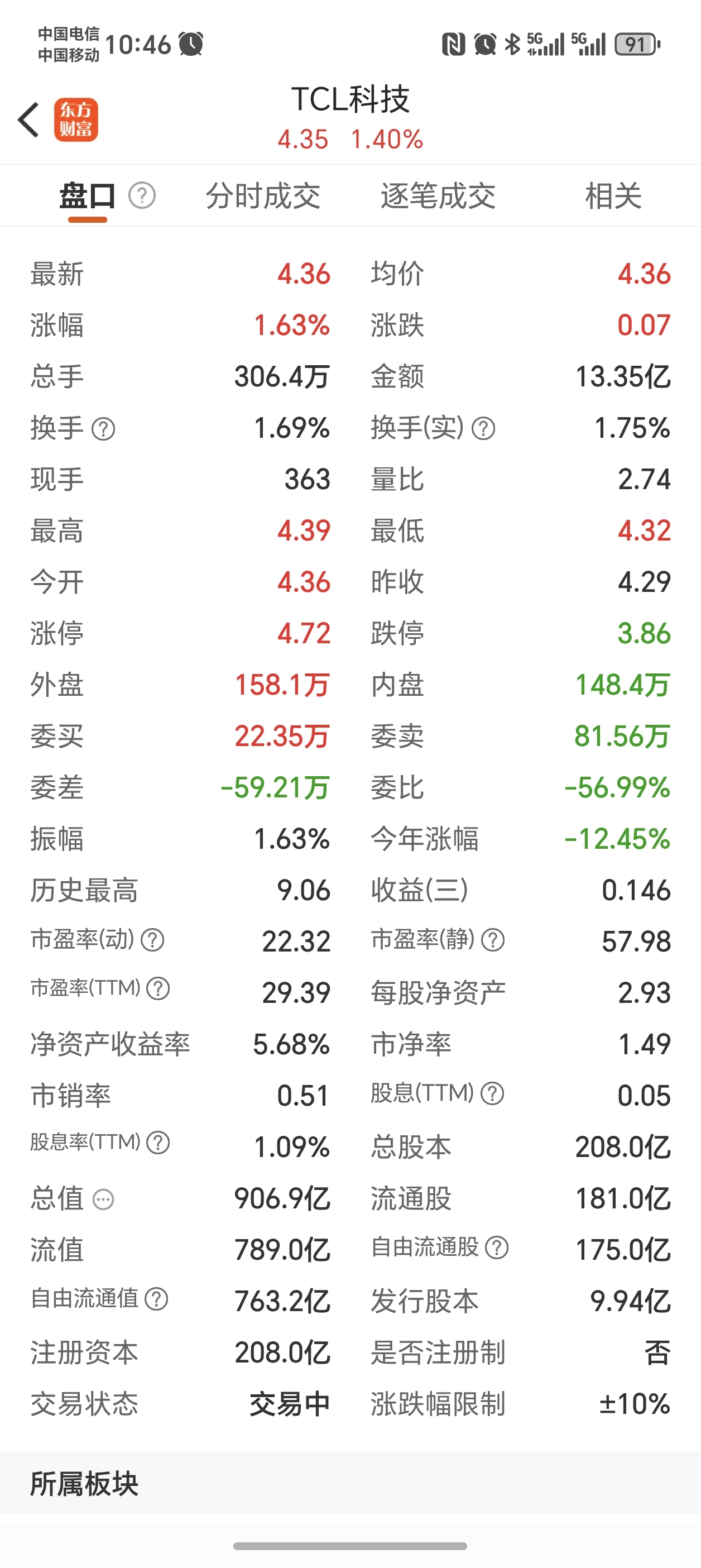 $TCL科技(SZ000100)$ 委卖81万,委买只有21万…是多么想清仓