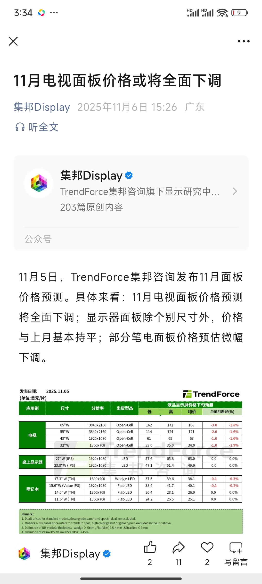 $TCL科技(SZ000100)$ 周期走完了,面板价格又进入下跌通道